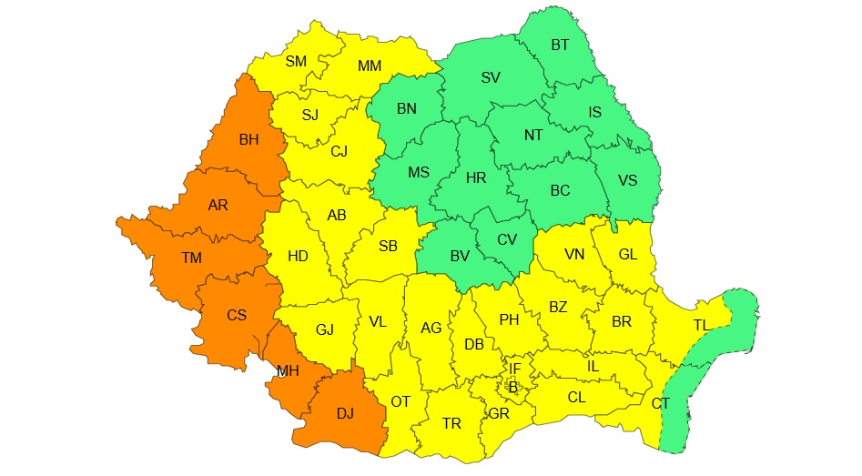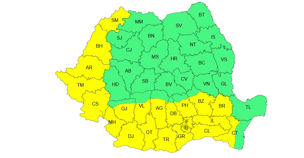 Atenționarea de tipul cod galben va fi valabil de sâmbătă, ora 12:00 până duminică, ora 10:00 în județele Arad, Bihor, Satu Mare,Timiș, Caraș-Severin, Mehedinți, Dolj, Olt, Teleorman, Giurgiu, Ilfov, Călărași, Ialomița, Brăila, București, precum și în cea mai mare parte a județelor Constanța, Buzău, Prahova, Dâmbovița, Argeș, Vâlcea și Gorj.