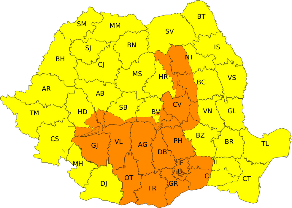 Potrivit meteorologilor, în intervalul 29 septembrie, ora 10:00 – 30 septembrie, ora 12:00, va fi Cod portocaliu de ploi torenţiale şi abundente în judeţele nordul şi estul Olteniei, cea mai mare parte a Munteniei, Carpaţii Meridionali şi Orientali, inclusiv în Bucureşti. Cantităţile de apă vor fi de 50 până la 90 litri/mp şi, izolat, vor depăşi 100 l/mp.