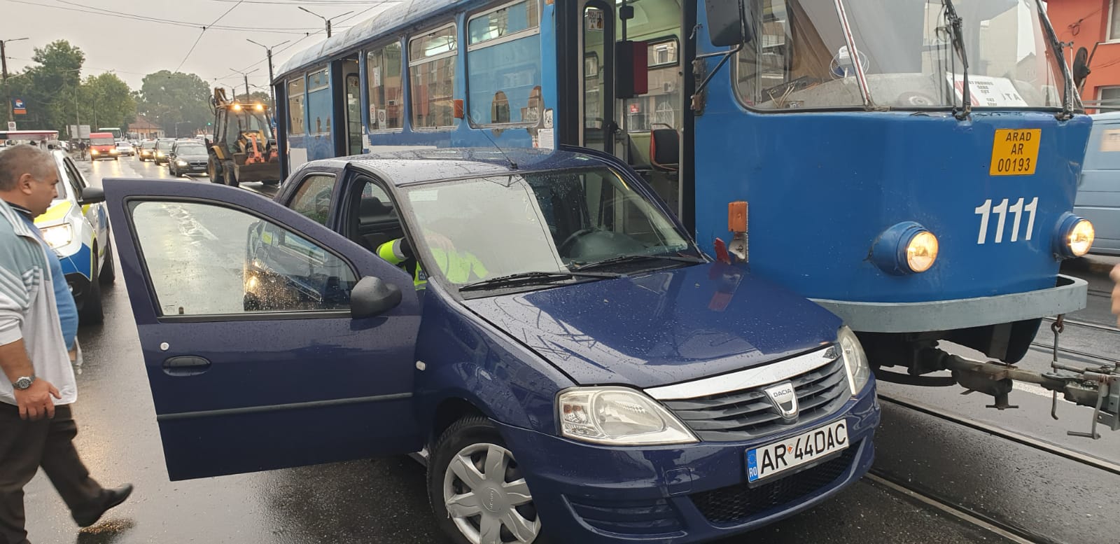 UPDATE: Din primele cercetări la fața locului, polițiștii au stabilit că în jurul orei 7:30, un bărbat în vârstă de 75 de ani, în timp ce conducea un autoturism pe strada Petru Rareș, în dreptul unui hotel nu s-a asigurat la schimbarea benzii de mers, fiind acroșat de un tramvai condus de un bărbat de 56 de ani, din Arad. În urma evenimentului rutier a fost rănit ușor conducătorul auto. Potrivit IPJ Arad, cei doi bărbați au fost testați cu aparatul alcooltest, rezultatul fiind 0.