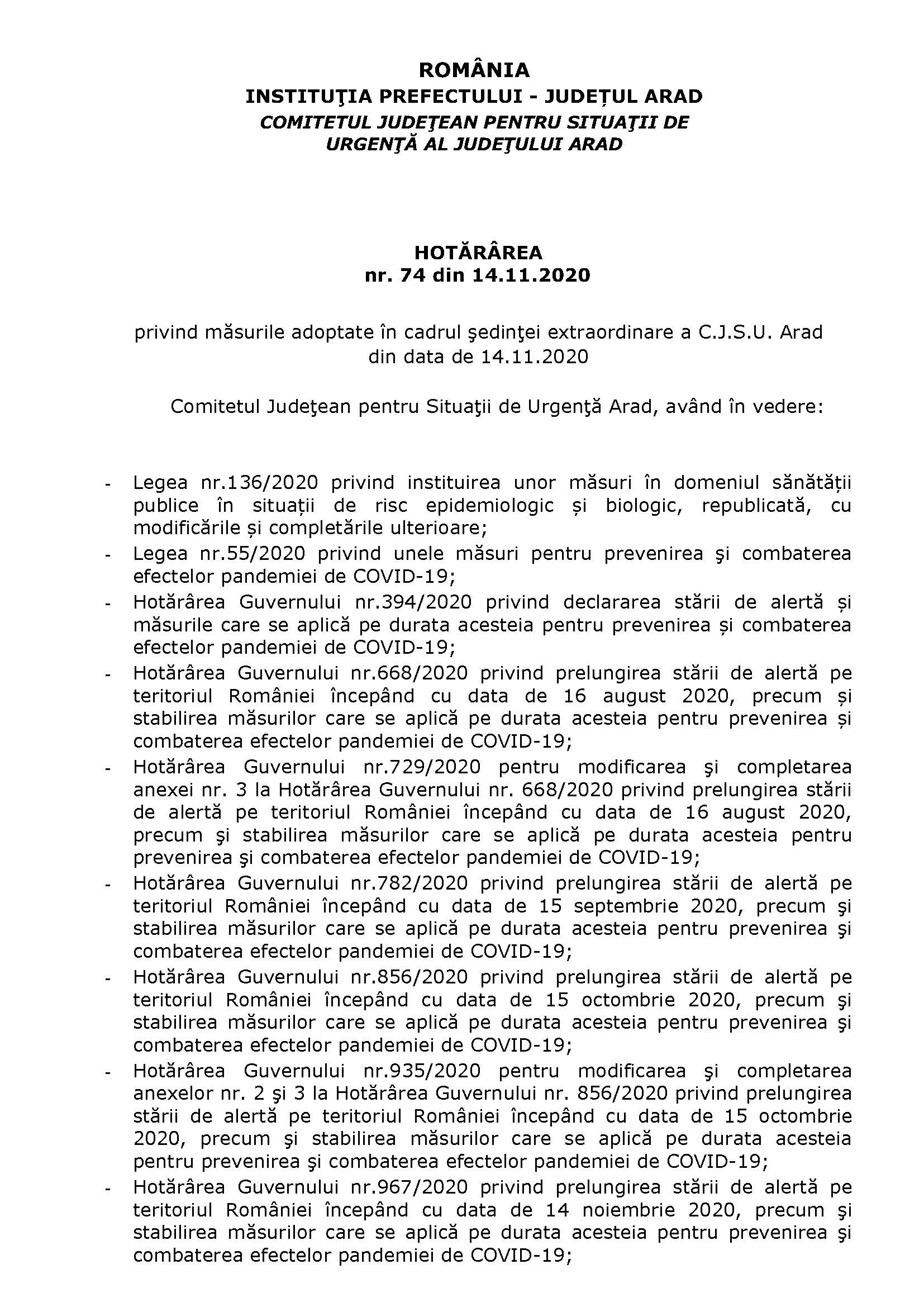 În hotărârea de astăzi, se mai prevede că Direcția de Sănătate Publică a Județului Arad va calcula zilnic, pentru fiecare unitate administrativ-teritorială, incidența cumulată pentru ultimele 14 zile și va prezenta Comitetului Județean pentru Situații de Urgență Arad analiza rezultată, în cel mult 24 de ore de la data constatării atingerii limitelor stabilite în H.G. nr. 967/2020. De asemenea, DSP va face propuneri de carantinare zonală în unitățile administrativ-teritoriale în care se impune această măsură, după obținerea, în prealabil, a avizului de la Insitutul Național de Sănătate Publică.