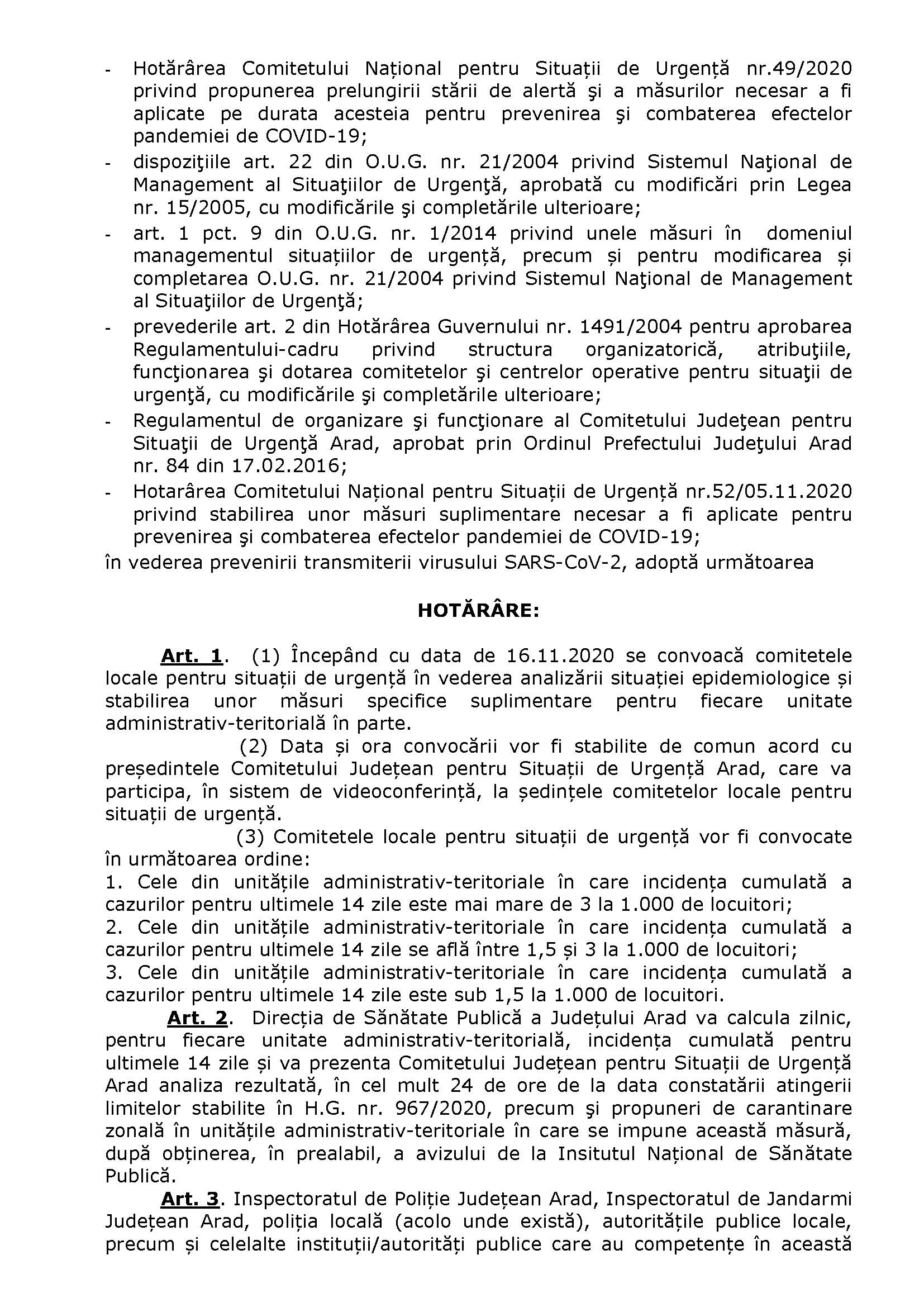 Data și ora convocării vor fi stabilite de comun acord cu președintele Comitetului Județean pentru Situații de Urgență Arad, care va participa, în sistem de videoconferință, la ședințele comitetelor locale pentru situații de urgență, începând cu data de 16 noiembrie.