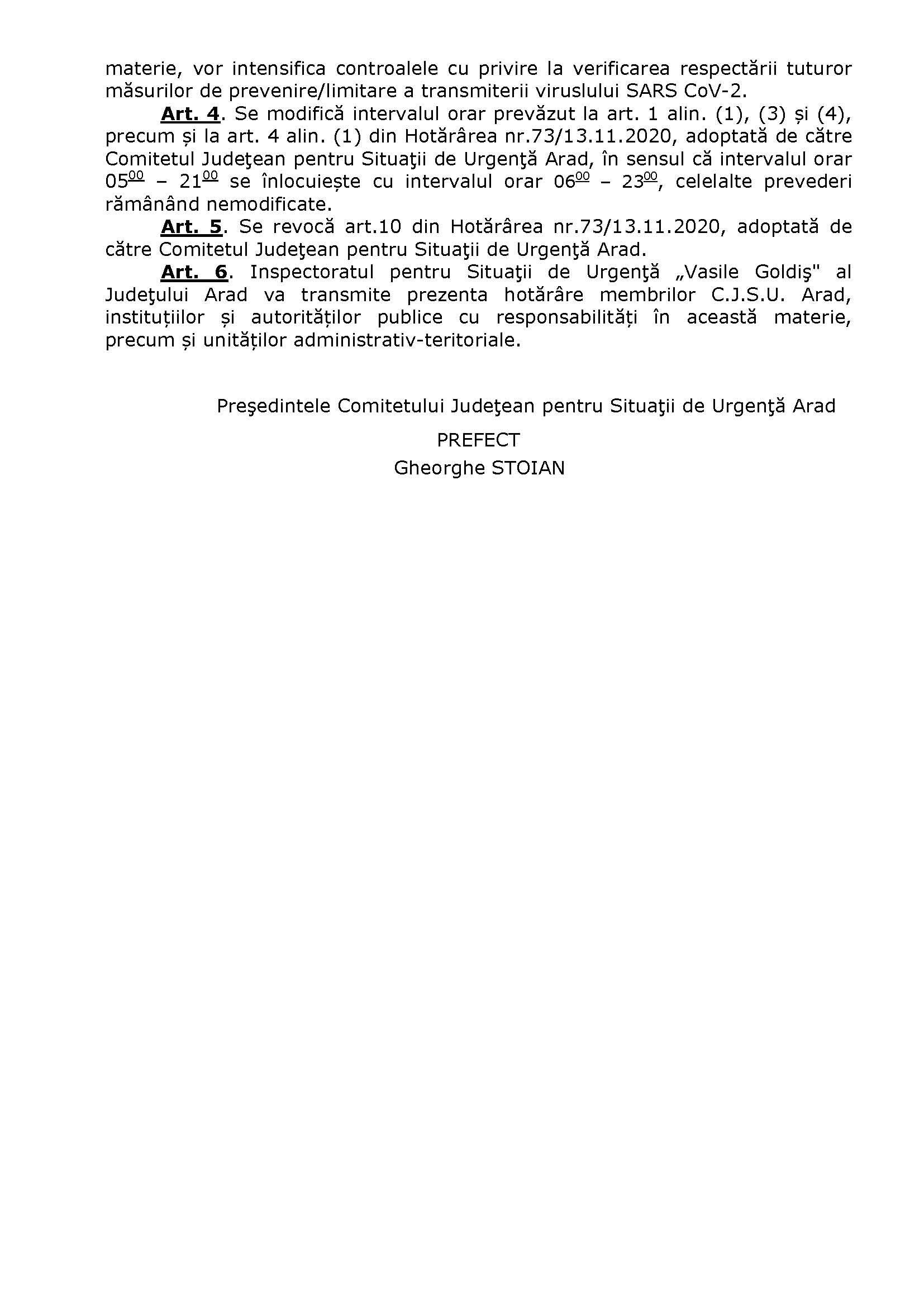 La rândul lor, Inspectoratul de Poliție Județean Arad, Inspectoratul de Jandarmi Județean Arad, poliția locală (acolo unde există), autoritățile publice locale, precum și celelalte instituții/autorități publice care au competențe în această materie, vor intensifica controalele cu privire la verificarea respectării tuturor măsurilor de prevenire/limitare a transmiterii viruslului SARS CoV-2.