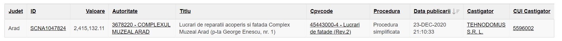 ARAD. Pe 23 decembrie a fost atribuit contractul de execuție a lucrărilor de „reparații capitale la Palatul Cultural – Muzeul Județean, din cadrul imobilului situat în Arad, Piața George Enescu, nr. 1”. A fost depusă o singură ofertă, aceasta fiind și câștigătoare: cea a firmei Tehnodomus. Tot ei au reabilitat și cealaltă parte a clădirii, în care funcționează Filarmonica Arad, tot ei au reabilitat și Colegiul Economic Arad, tot ei au lucrat și la Podul Decebal – pe care l-au reasfaltat de mai multe ori din cauza neconformităților, tot ei au lucrat pentru o perioadă și la Stadionul UTA, tot ei lucrează și pe șantierul noului Palat al Copiilor, precum și pe șantierul de reabilitare a Teatrului Clasic „Ioan Slavici”. Acum, aceștia vor lucra și la Palatul Cultural, partea dinspre Parcul Copiilor. Pentru contractul semnat pe 23 decembrie vor încasa de la Complexul Muzeal Arad 2.415.132 de lei, conform Sistemului Electronic de Achiziții Publice.