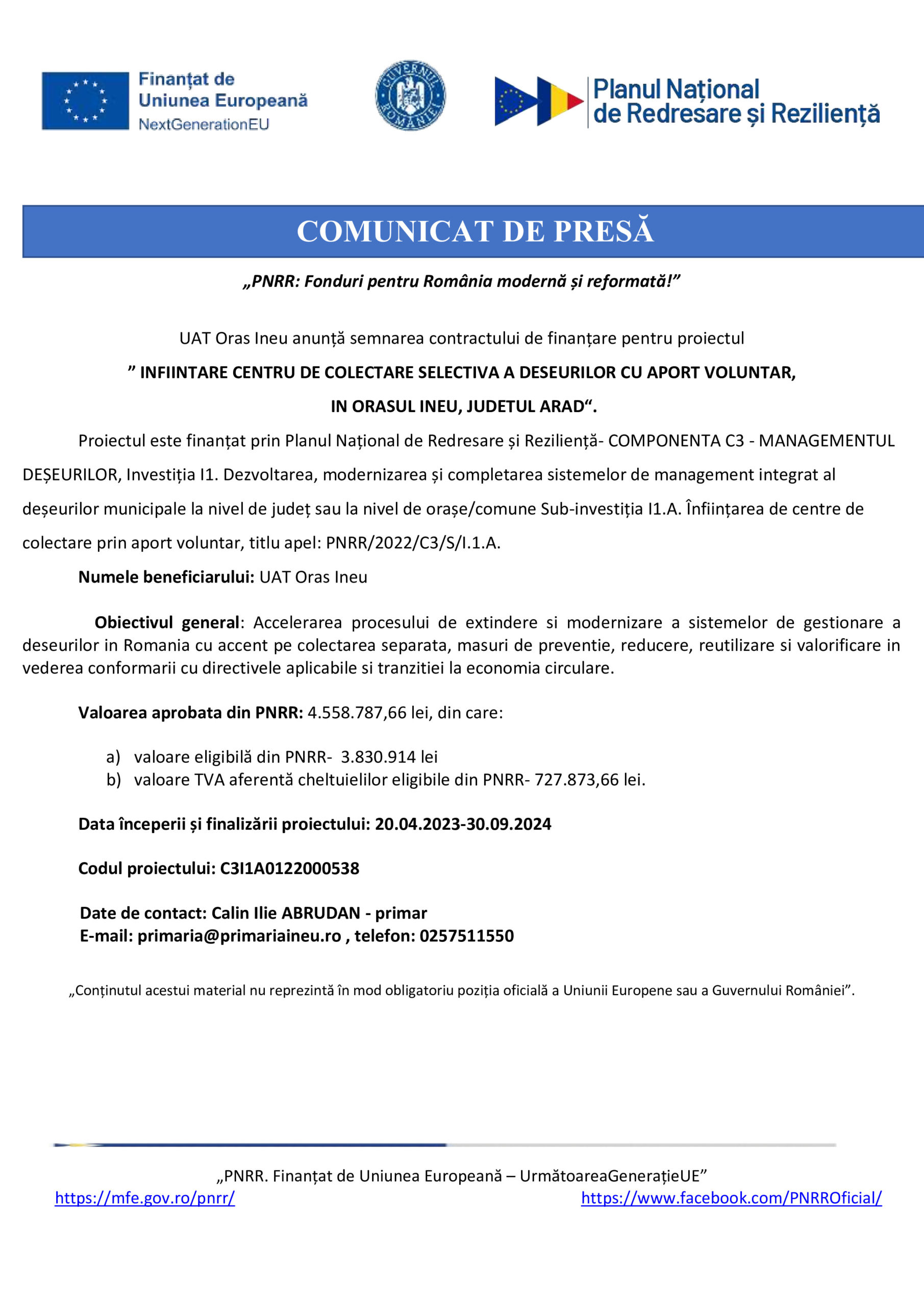 UAT Oras Ineu anunță semnarea contractului de finanțare pentru proiectul