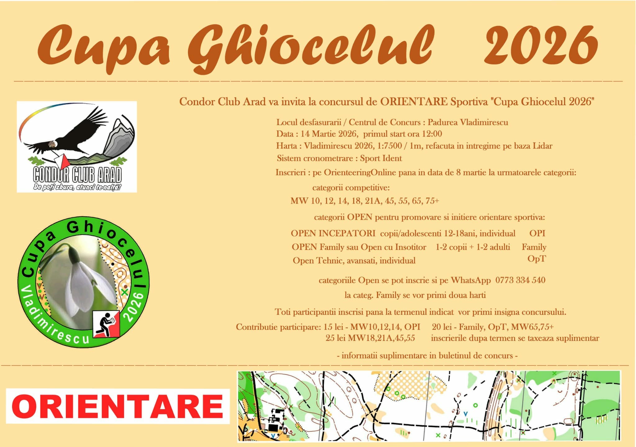 Înscrierile se fac pe OrienteeringOnline până duminică, 8 martie 2026, la următoarele categorii: *categorii competitive: MW 10, 12, 14, 18, 21A, 45, 55, 65, 75+; *categorii OPEN pentru promovare și inițiere orientare sportivă: OPI (Open Începători copii/ adolescenți 12-18 ani, individual), Family (Open Family sau Open cu Însoțitor 1-2 copii + 1-2 adulți), OpT (Open Tehnic, avansați, individual). „Categoriile Open se pot înscrie și pe WhatsApp la numărul 0773-334540. La categoria Family se vor primi două hărți. Toți participanții înscriși până la termenul indicat vor primi insigna concursului” – transmit organizatorii.