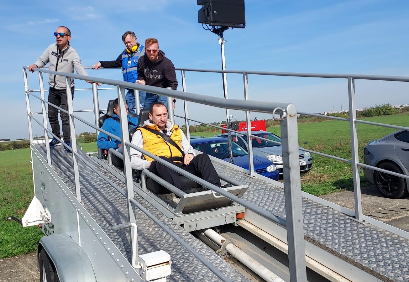 V.P.: Pentru două persoane, prinse binențeles cu centura de siguranță, se simulează un impact la viteza de 15 km/h. Când realizează oamenii cât de tare sunt zdruncinați la această viteză mica, îi cam pune pe gânduri. Își dau seama ce ar putea să pățească la o viteză mai mare. Dar pentru că nu e ușor să ne deplasăm cu acest simulator și cu tot ce mai avem, lucrăm de obicei cu firme, care vor să-și instruiască angajații. De altfel noi instruim cam tot ceea ce ține de patru roți, pregătim inclusiv piloți de raliuri, prin școala de pilotaj care îmi poartă numele.