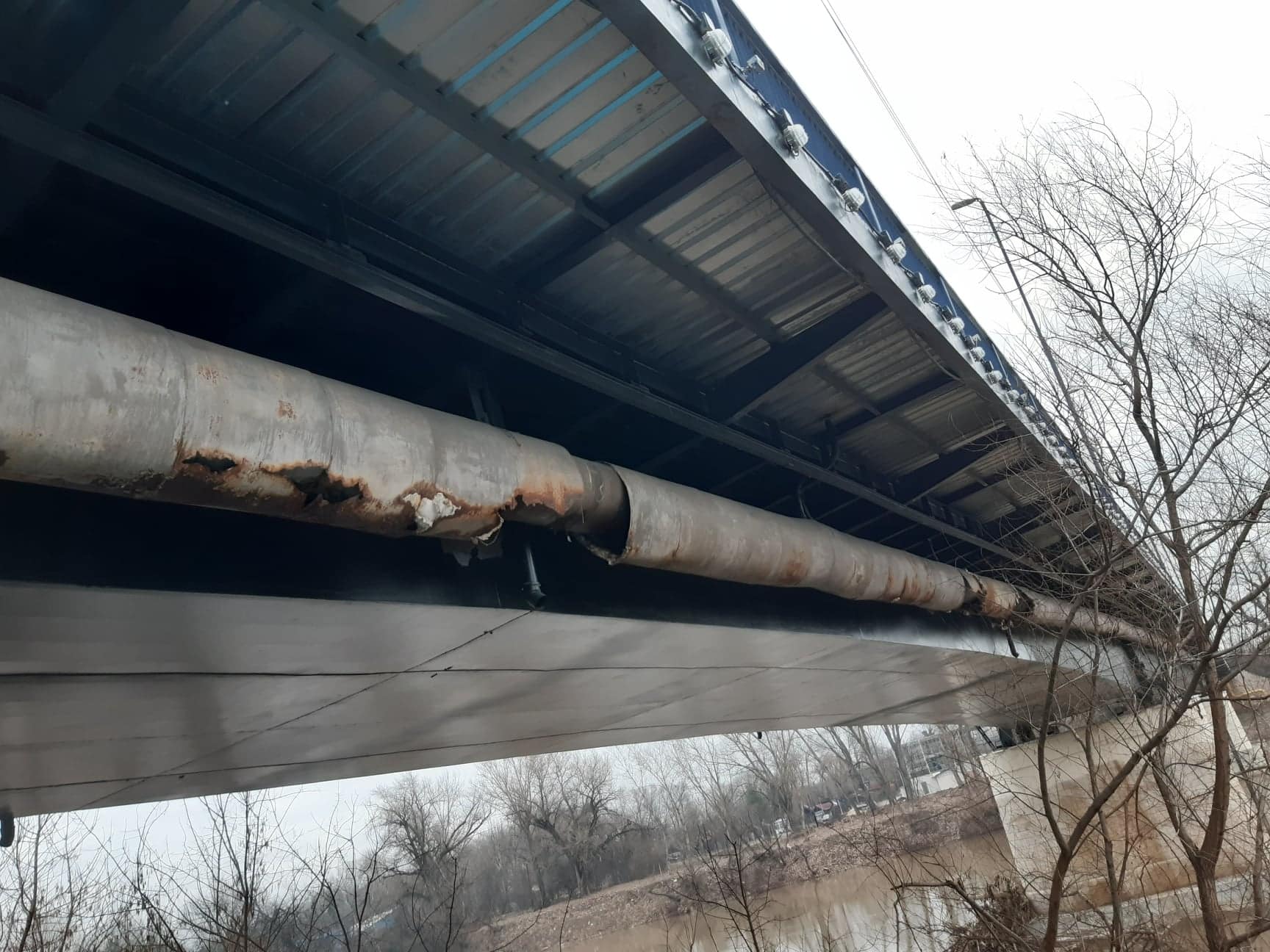 ARAD. Reabilitarea Podului Decebal pare o telenovelă fără sfârşit. Să ne amintim de cele trei runde de asfaltare şi reasfaltare a carosabilului sau de corpurile de iluminat din părţile laterale ale podului, înlocuite după ce au fost vopsite într-o culoare închisă. De data aceasta, ne oprim asupra unei conducte de sub pod care arată… ca şi cum ar fi a nimănui. Se află în partea dinspre Baza UTA şi are învelişul distrus în mai multe locuri, pe toată lungimea sa.