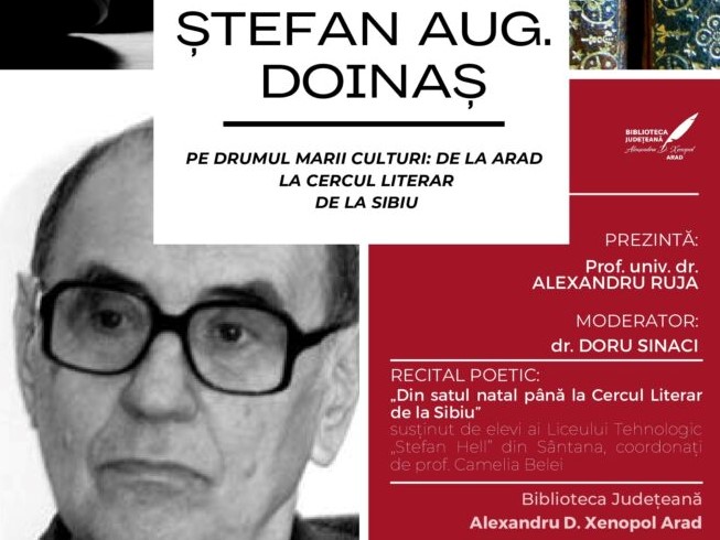 În cadrul evenimentelor dedicate centenarului nașterii lui Ștefan Augustin Doinaș, Biblioteca Județeană „Alexandru D. Xenopol” Arad organizează, în data de 24 noiembrie, începând cu ora 13, conferința cu tema „Ștefan Aug. Doinaș pe drumul marii culturi: de la Arad la Cercul Literar de la Sibiu”, susținută de prof. univ. dr. Alexandru Ruja, Universitatea de Vest Timișoara.