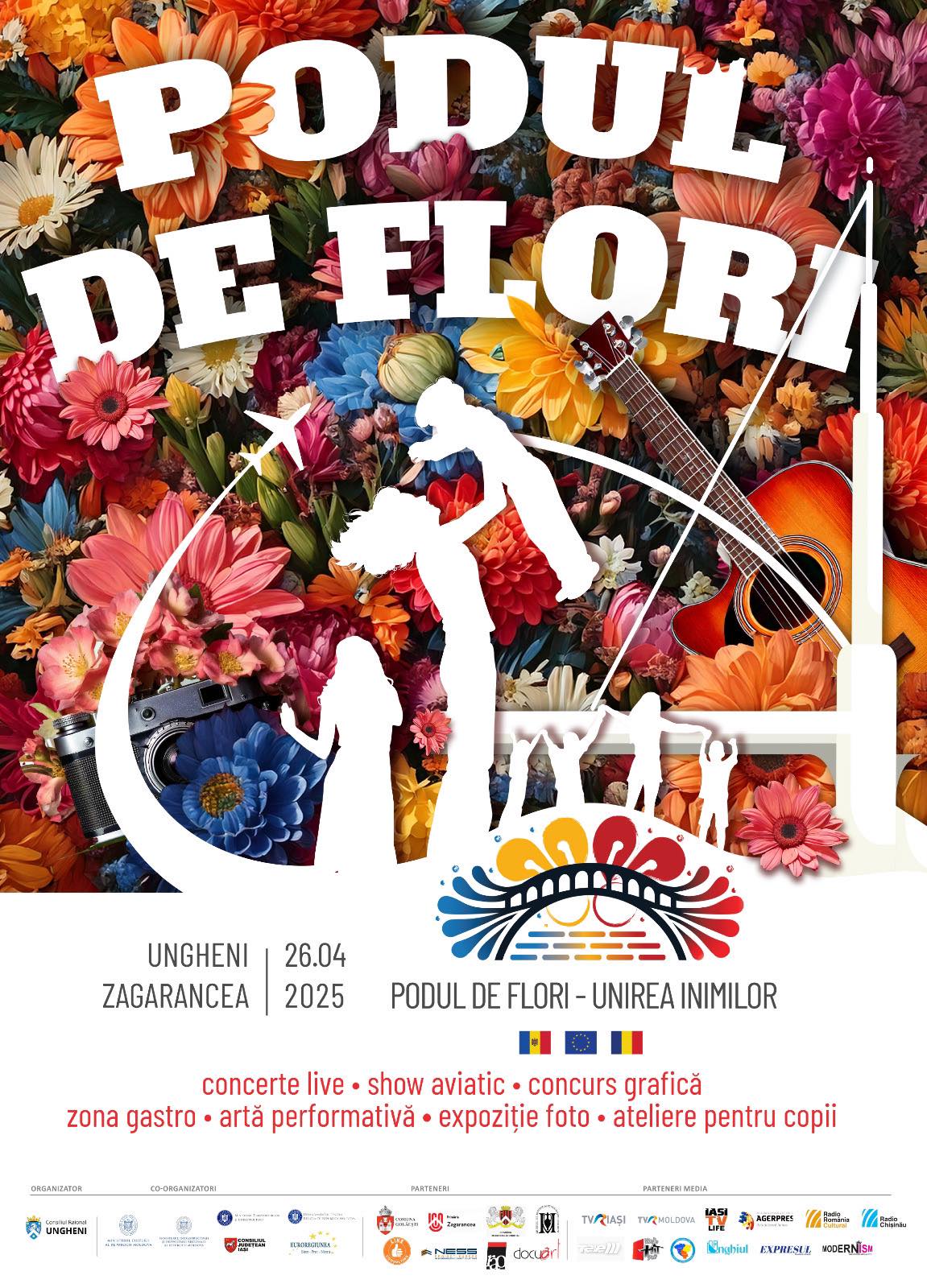 „Festivalul Podul de Flori – o sărbătoare a legăturilor, a libertății și a drumului spre viitor! Pe 26 aprilie 2025, România și Republica Moldova marchează împreună lansarea unui proiect istoric – construcția podului rutier de la Ungheni – printr-un eveniment simbolic organizat pe malul Prutului: Festivalul Podul de Flori. Comuna Zagarancea, raionul Ungheni, devine scena unui eveniment de excepție: Festivalul Podul de Flori, un moment care va marca nu doar 35 de ani de la emoționanta manifestație din 1990, când zeci de mii de oameni s-au îmbrățișat peste Prut, dar și începerea lucrărilor la primul pod rutier construit peste Prut în ultimele șase decenii. Festivalul va fi, în același timp, o celebrare a libertății, a drumului comun către Europa și a legăturilor ce unesc comunitățile noastre dincolo de granițe. Este o dată cu puternică încărcătură simbolică, în care onorăm trecutul, marcăm prezentul și construim viitorul împreună. Un line-up excepțional este pregătit pentru această zi de sărbătoare, iar numele tuturor artiștilor va fi comunicat în curând. Până atunci, Cristofor Aldea-Teodorovici și Lupii lui Calancea se antrenează intens pentru un concert emoționant, dedicat acestei aniversări istorice”, anunță reprezentanții Raionului Ungheni.