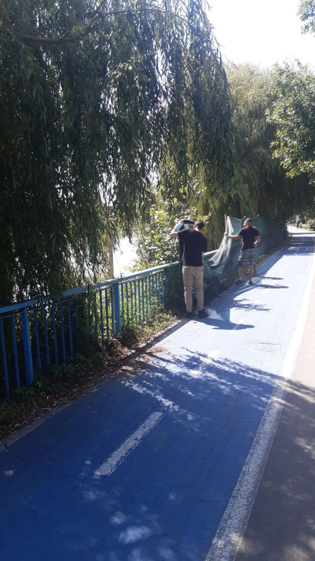 Nu a fost nevoie decât de nişte leaţuri de lemn, câteva coliere din plastic pentru prindere şi câţiva metri de plasă de protecţie, din aceea care se foloseşte la „îmbrăcarea” clădirilor aflate în construcţie sau reabilitare. Astfel, înălţimea balustradei care delimiteză aleea din parc de albia râului (unde e amenajată o terasă) a fost dublată, întreaga suprafaţă fiind opacizată, desigur. Aceasta şi era ideea autorilor construcţiei: de a îngrădi accesul vizual (gratuit) al celor care trec prin zonă spre terasa unde a fost încropit un „cinema în aer liber”. Că gardul/peretele nu a fost autorizat de autorităţi, că e în totală discordanţă cu ambientul… asta se pare că nu a mai contat.