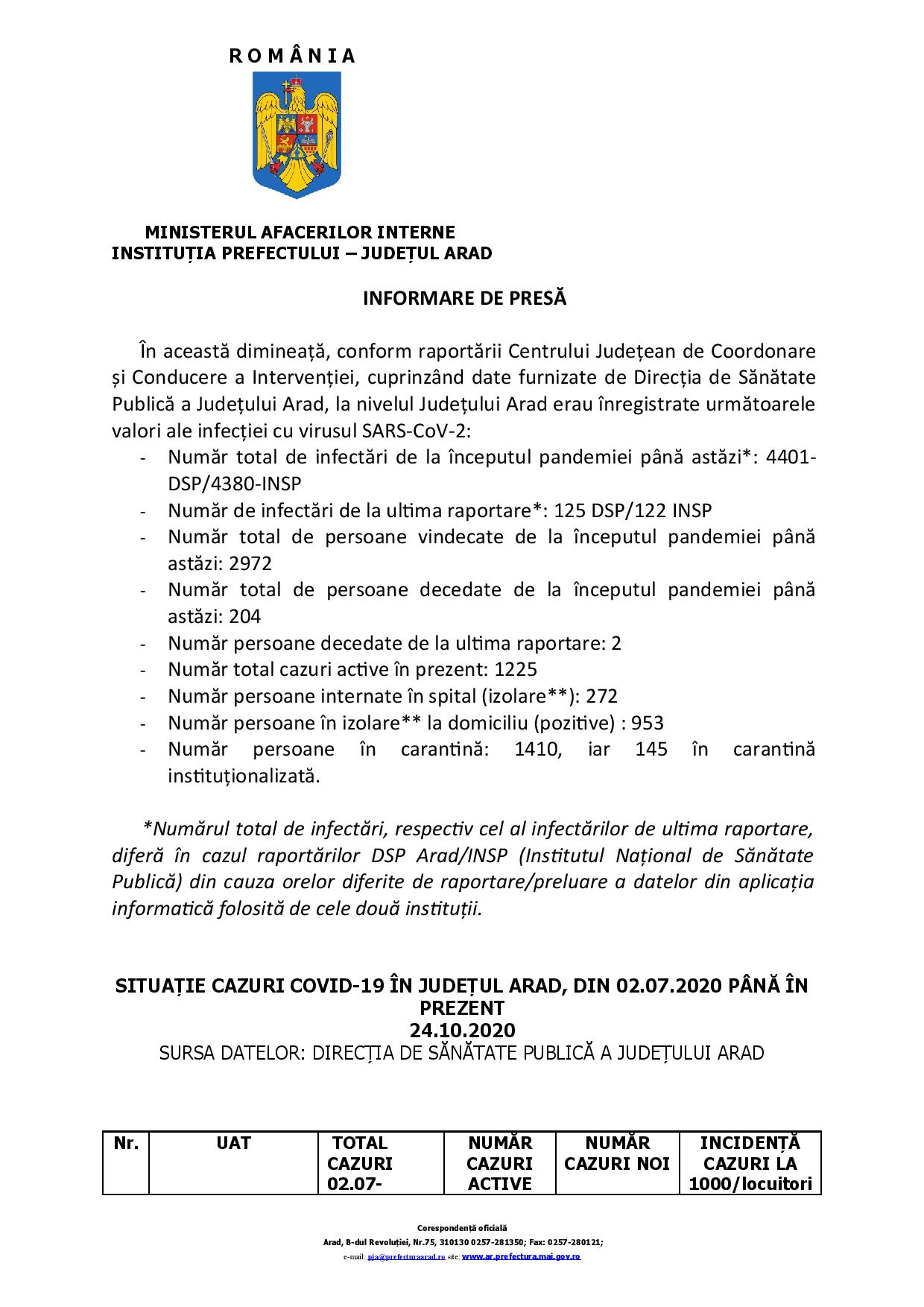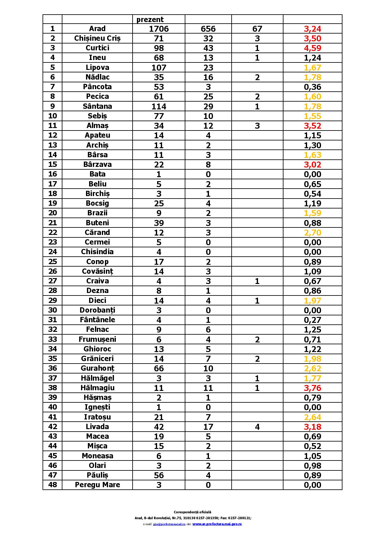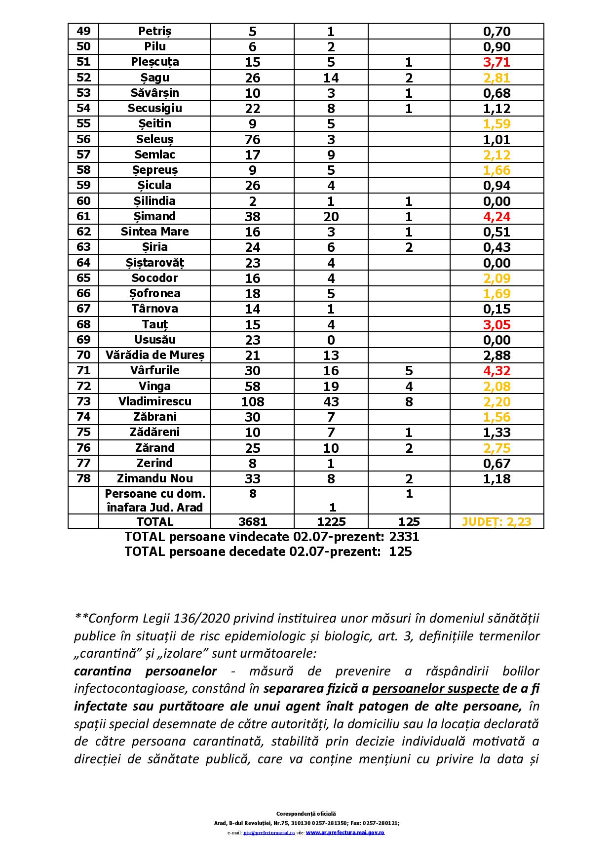 Cazurile noi înregistrate în județul Arad sunt distribuite pe orașe și comune astfel: