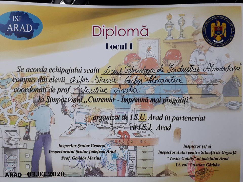 ARAD. Echipa Liceului Tehnologic de Industrie Alimentară Arad, formată din Alexandra Gabor și Diana Chifor, ambele eleve în clasa a XI-a B, au obținut premiul I la simpozionul „Cutremurul – împreună mai pregătiți” organizat de Inspectoratul pentru Situații de Urgență Arad, în colaborare cu Inspectoratul Şcolar Judeţean Arad.