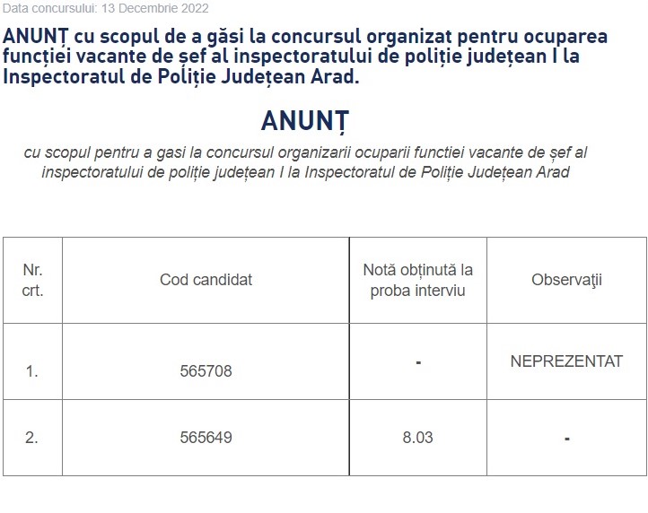 BUCUREȘTI. Rezultatele au fost publicate pe site-ul IPGR. Așadar, IPJ Arad are inspector șef!Comisarul șef Dan Stoicănescu a venit împuternicit pe funcția de inspector șef al IPJ Arad la 1 iulie, pentru o perioadă de 3 luni. La expirarea perioadei, IGPR a prelungit împuternicirea lui Stoicănescu pentru încă trei luni. Iar acum, după ce a obținut nota 8.03 la interviul pentru ocuparea funcției de inspector șef, Stoicănescu va rămâne la Arad.Mai rămâne ca IGPR să organizeze concurs și pentru cele două funcții de adjunct în cadrul IPJ Arad. Una dintre funcțiile de adjunct este ocupată până la sfârșitul anului, prin împuternicire, de comisarul șef Florin Turnagiu, venit de la IPJ Timiș, de pe funcția de șef în cadrul Serviciului Rutier, în timp ce cealaltă este liberă.