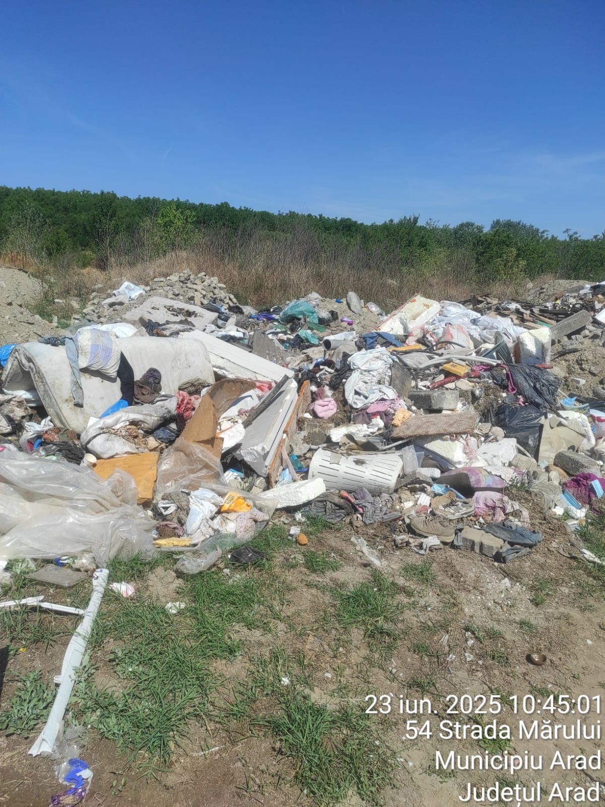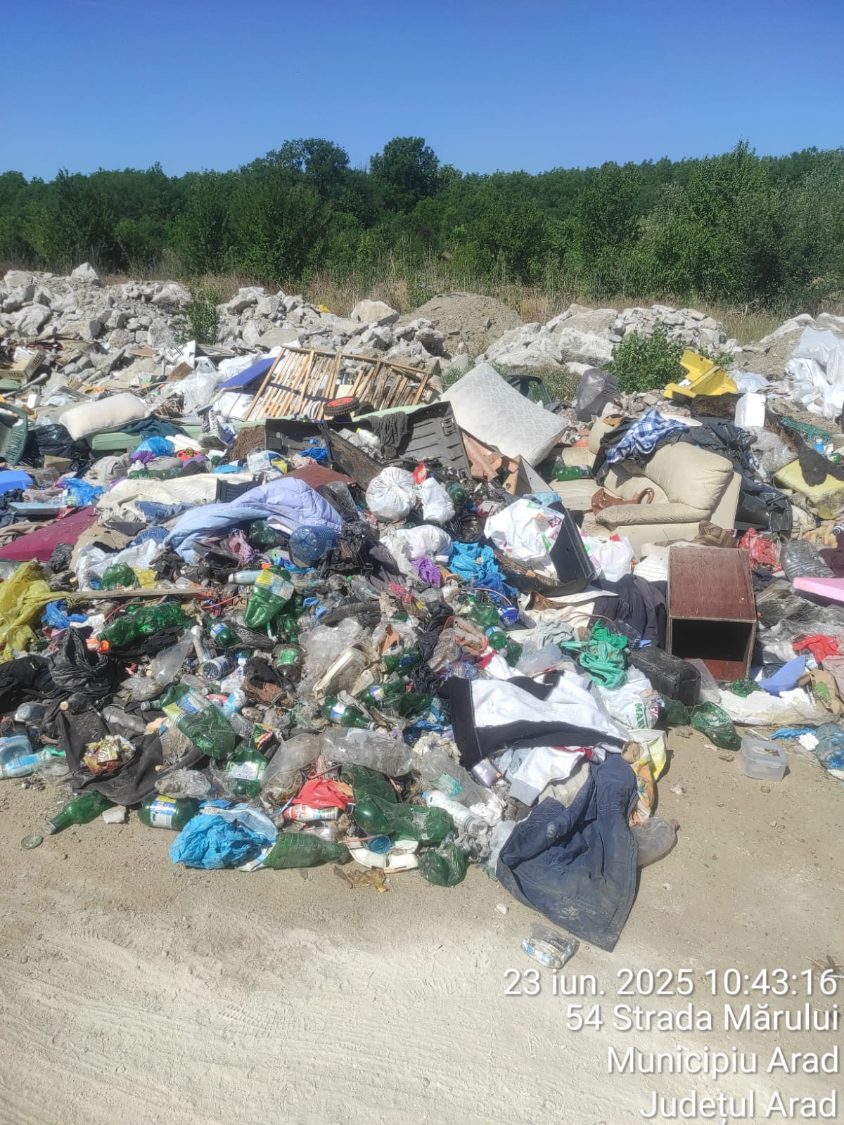 În cursul zilei de luni, 23 iunie, Garda Națională de Mediu – Comisariatul Județean Arad a constatat, pe raza municipiului Arad, o amplă zonă contaminată de deșeuri de diferite tipuri, într-un spațiu neautorizat, în zona străzii Mărului.