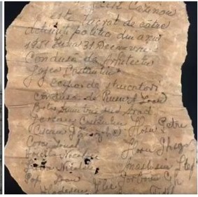 Este un strigăt de ajutor, scris de 14 dintre cei 100 de deţinuţi care au lucrat în anii 1950 la renovarea Cazinoului după bombardamentele din cel de-al Doilea Război Mondial. Aceştia au folosit o bucată de hârtie ruptă dintr-un sac de ciment, pe 31 decembrie 1951.