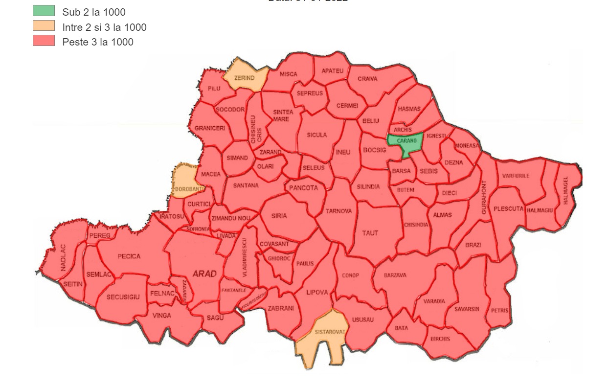 Singurele comune rămase cu sub trei cazuri de Covid-19 la mia de locuitori sunt Șiștarovăț – 2.71 cazuri, Dorobanți – 2.54, Zerind – 2.02 și Cărand – 1.87. În rest, toate comunele și orașele județului au incidențe mai mari de 3 cazuri la mia de locuitori. În contextul creșterii incidențelor, Comitetul Județean pentru Situații de … Continue reading Doar patru comune arădene scapă de „scenariul roșu”
