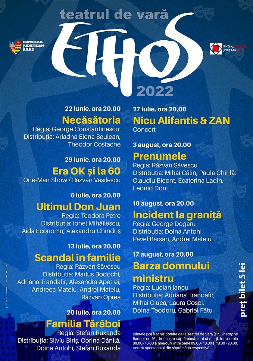 ARAD. Actori şi interpreţi de renume vor urca pe scena Teatrului de Vară, în perioada 22 iunie – 17 august. Centrul Cultural Judeţean a anunţat că printre cei care vor veni să îi încânte pe arădeni în această vară se numără: Răzvan Vasilescu, Adriana Trandafir, Silviu Biriș, Corina Dănilă, Marius Bodochi, Claudiu Bleonț sau Nicu Alifantis & Zan.