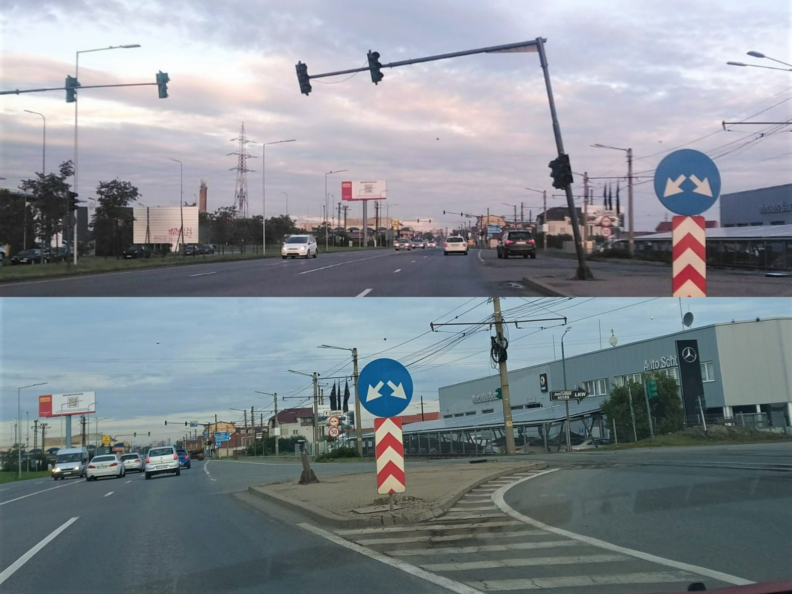 Cele două semafoare care dirijau traficul la ieşirea din Arad spre Deva, la joncţiunea bretelei de legătură între DN 7 şi centură (zona sensului giratoriu de la Selgos) au fost dărămate de două camioane, în doar două zile. Cel mic a fost complet pus la pământ, iar cel mare a stat înclinat o zi, până când administraţia locală l-a dat jos, pentru a nu cădea peste maşini.