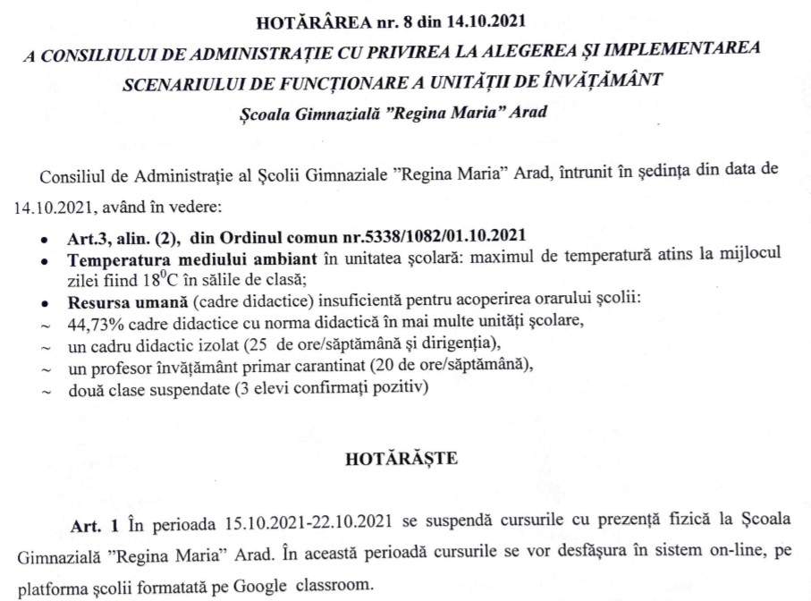 Este vorba despre Școala Gimnazială „Regina Maria” din municipiu, la care învață în jur de 500 de elevi din clasele I-VIII. Un părinte al unui elev din această școală a transmis pe adresa redacției Jurnal Arădean/aradon.ro hotărârea numărul 8 din 14 octombrie 2021 a Consiliului de Administrație. Hotărârea face referire la „alegerea și implementarea scenariului de funcționare a unității de învățământ”.