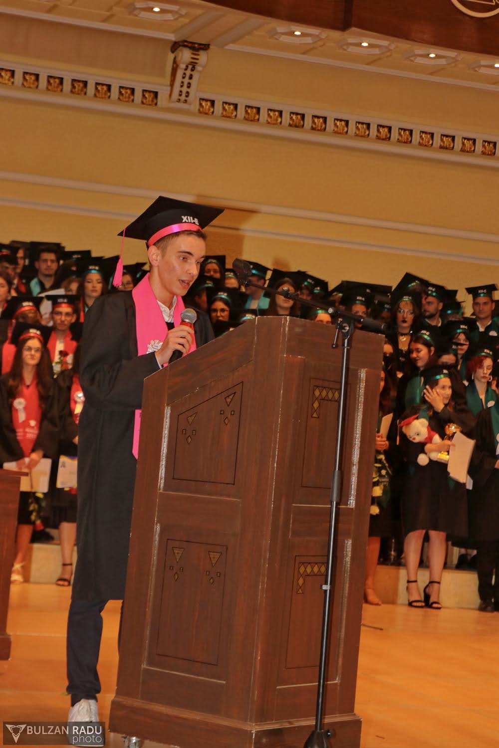 „Este o zi specială, memorabilă, în care totul este despre voi, dragii noștri absolvenți! Emoțiile pe care le resimțiți în aceste clipe ale despărțirii de liceu le veți purta în suflet, cu siguranță, toată viața… Stau mărturie în acest sens toți cei prezenți astăzi aici și toți cei care, la un moment dat al vieții, au tresărit la sunetul ultimului clopoțel, au răspuns prezent la ultima oră de dirigenție, ori și-au luat la revedere de la școală, colegi și profesori.