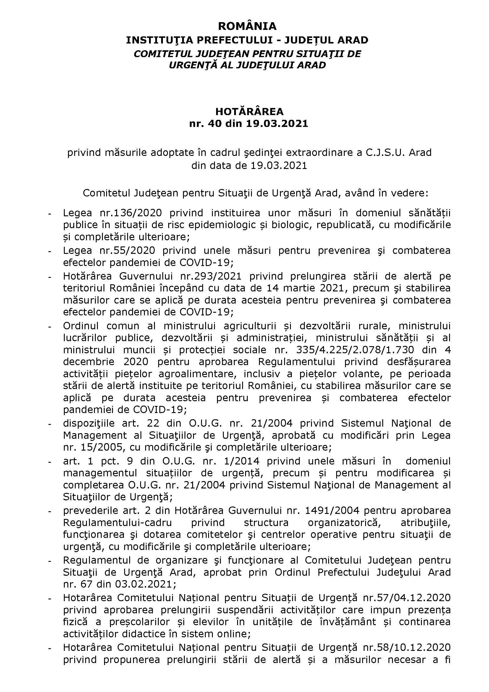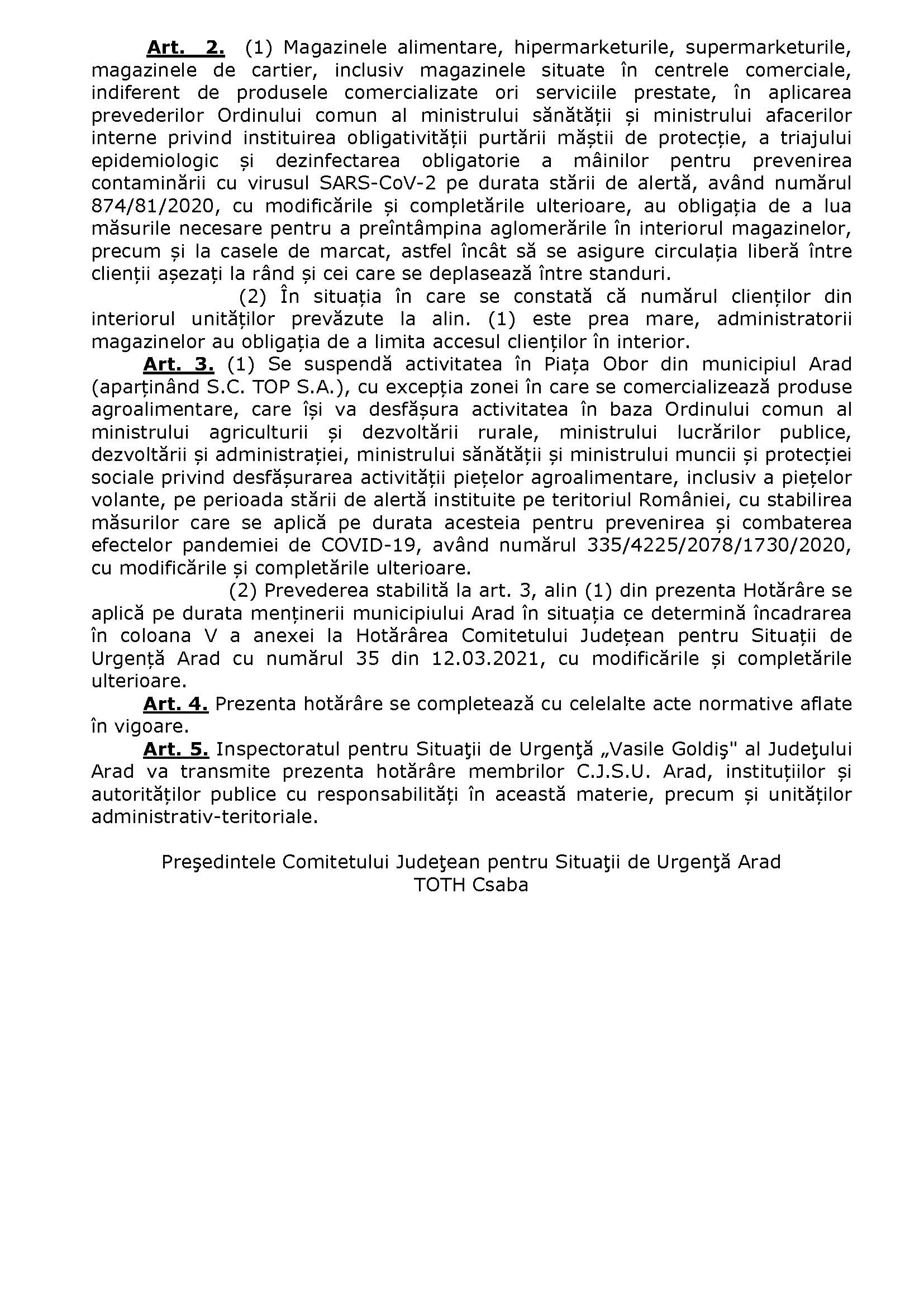 Prefectul Toth Csaba a precizat că prin aplicarea acestor măsuri și recomandări: „Dorim să evităm situația Timișorii, de exemplu, să ajungem să fim carantinați, cu atât mai mult cu cât se apropie Sărbătorile Pascale. Deocamdată, am dorit să luăm cât mai puține măsuri restrictive, să nu închidem sălile de sport, de exemplu, cum s-a întâmplat în alte județe, ci să limităm numărul de persoane prezente în săli în același timp. Solicităm, de asemenea, sprijinul mass-media pentru a explica arădenilor importanța respectării acestor măsuri, pentru a avea sărbători liniștite”, a încheiat prefectul Județului.