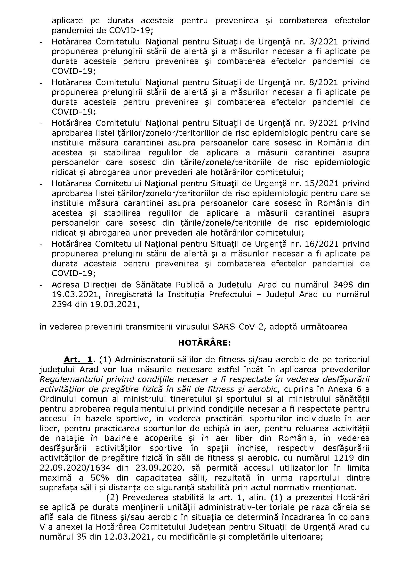 De asemenea, se revine și asupra funcționării sălilor de sport. Astfel, administratorii sălilor de fitness și/sau aerobic de pe teritoriul județului Arad vor lua măsurile necesare astfel încât să permită accesul utilizatorilor în limita maximă a 50% din capacitatea sălii, rezultată în urma raportului dintre suprafața sălii și distanța de siguranță stabilită prin actul normativ menționat”, se arată în HCJSU.