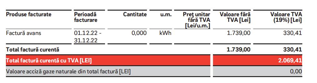 „Părinţii mei stau într-o casă ce aparţine de o persoană juridică. La una dintre locaţii s-a primit o factură de 21.000 de lei de plată în avans, iar la casa în care locuiesc părinţii mei 2.069 de lei. Cum se poate factura ceva în avans, fără număr de kWh?Există şi somaţie să plătească într-o săptămână sau se taie gazul. Factura a fost primită în 21 noiembrie cu termen de plată 2 decembrie”.