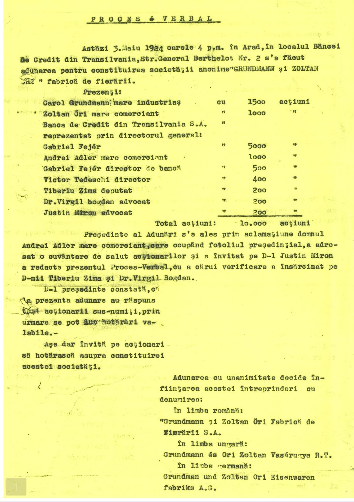 Înființarea firmei este consemnată într-un proces verbal datat 3 mai 1924, ”la oarele 4 p.m. în localul Băncii de Credit din Transilvania, str, General Berthelot, nr. 2 s-a făcut adunarea pentru constituirea societății GRUNDMANN și ZOLTAN ORI, fabrică de fierărie. Președinte al adunării s-a ales prin aclamațiune domnul Andrei Adler mare comerciant, care ocupând fotoliul prezidențial a adresat o cuvântare de salut acționarilor. La momentul constituirii, societatea avea 10 asociați.”