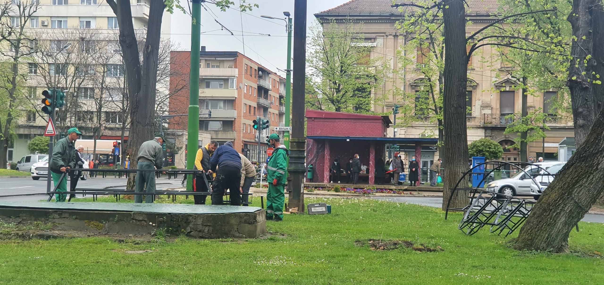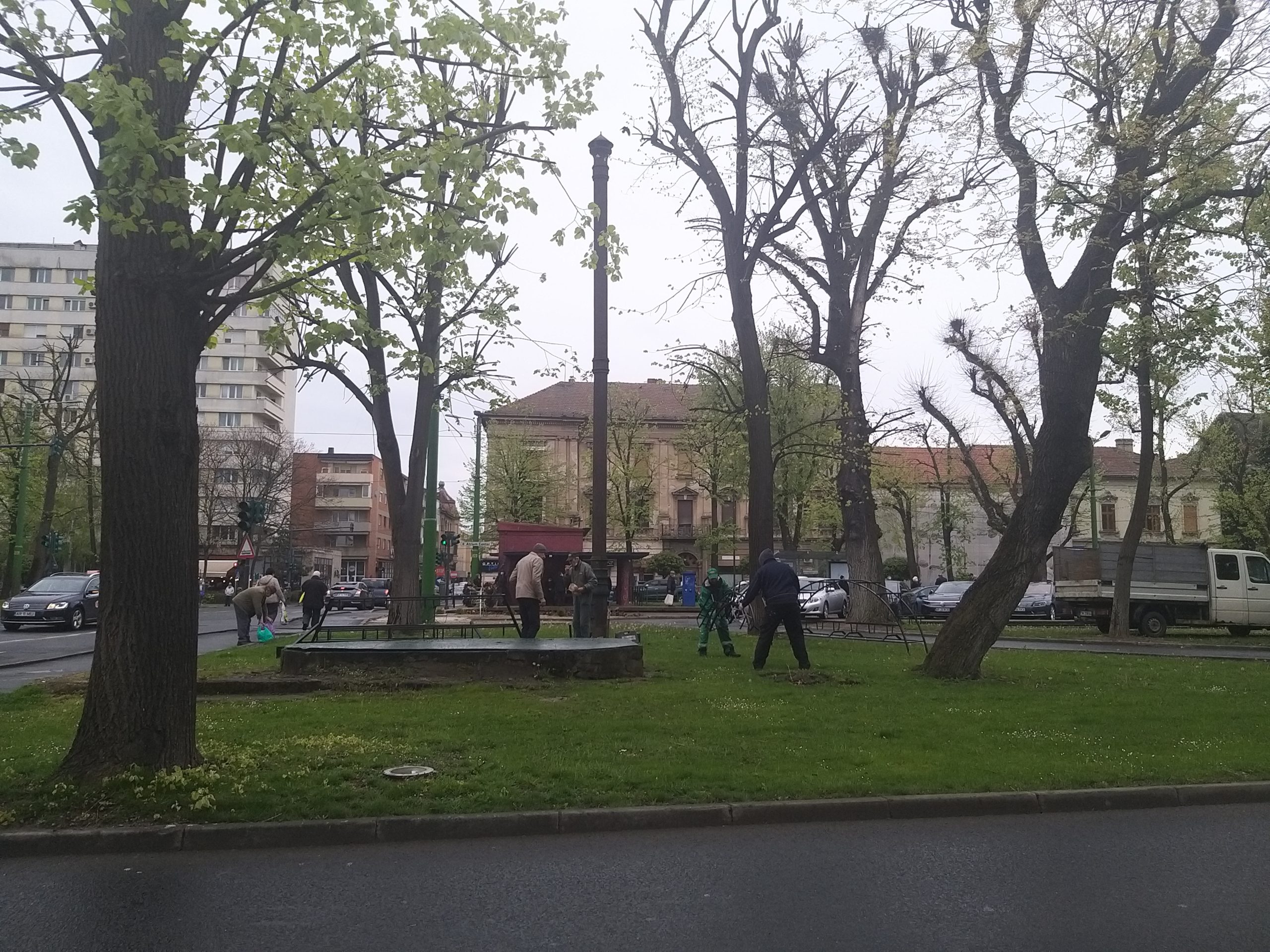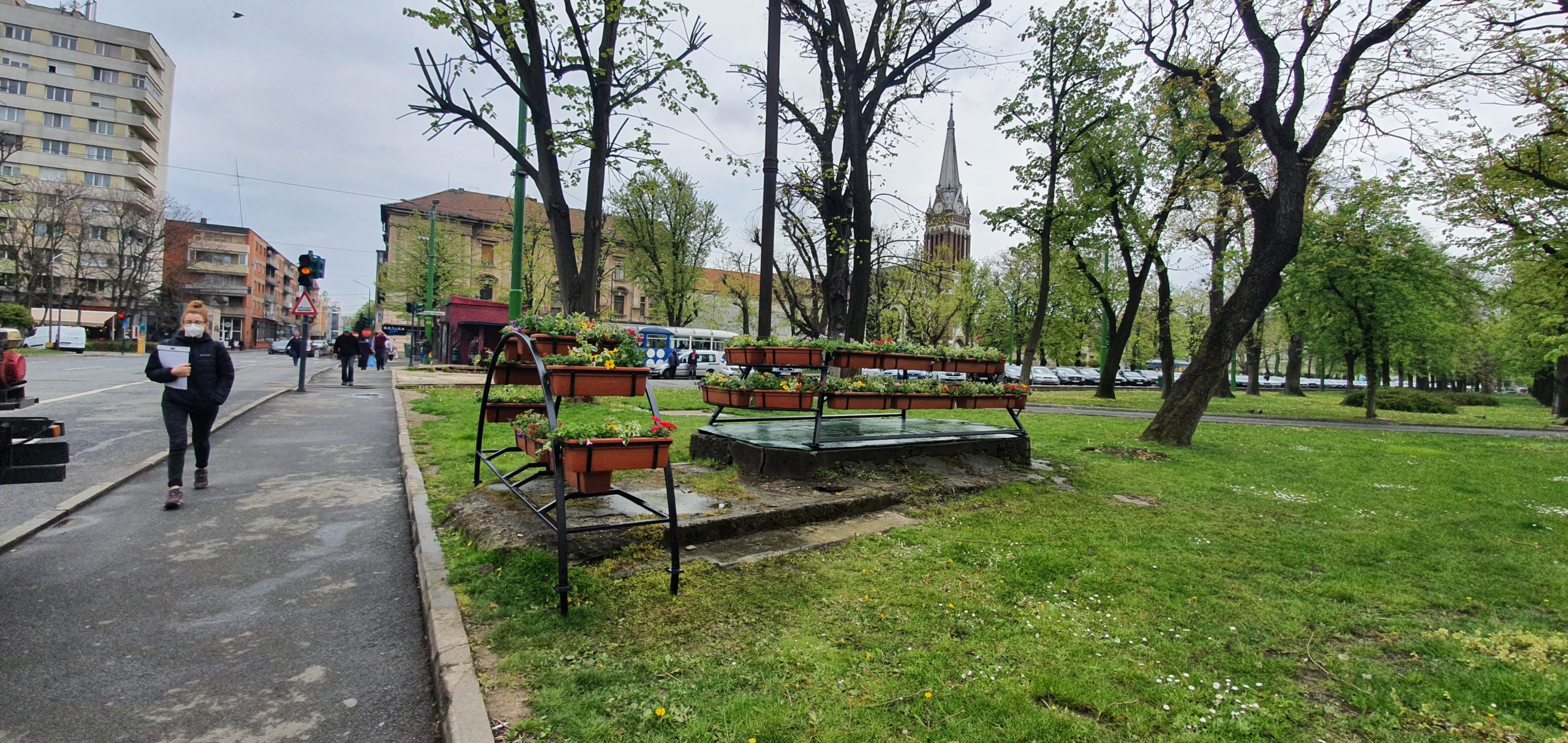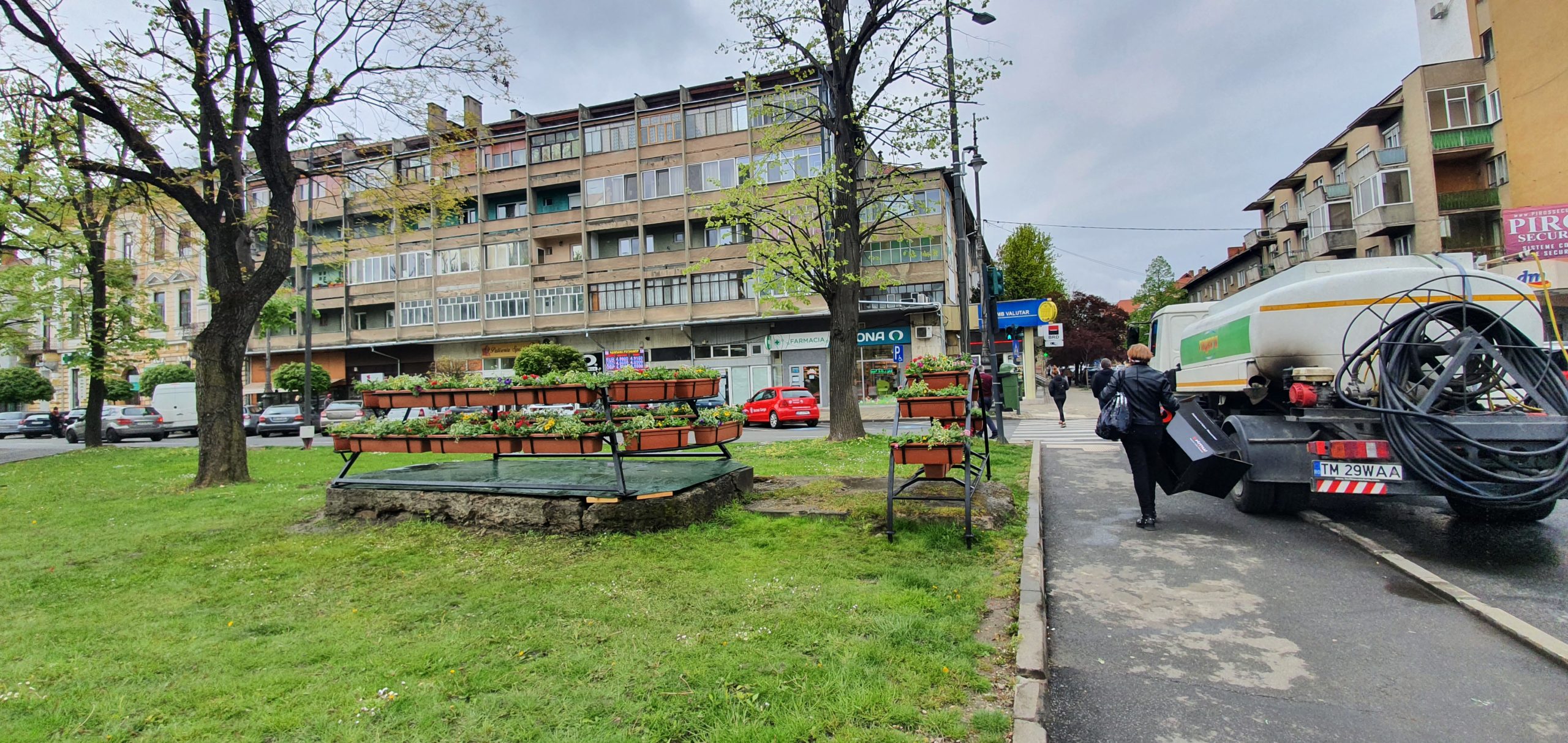 Una dintre instalațiile aduse chiar ieri de dimineață de către muncitorii firmei care se ocupă de zona înverzită de aici a fost astfel gândită încât să acopere imensa placă de beton care mușca din covorul verde dintre liniile de tramvai. Acum betonul a fost înlocuit cu ghirlande de flori multicolore iar zona, dacă va beneficia pe mai departe de atenția firmei în cauză, promite să se apropie de imaginea – poate cea mai reușită dintre toate – a spațiului verde dintre liniile de tramvai situat în zona Teatrului Ioan Slavici.
