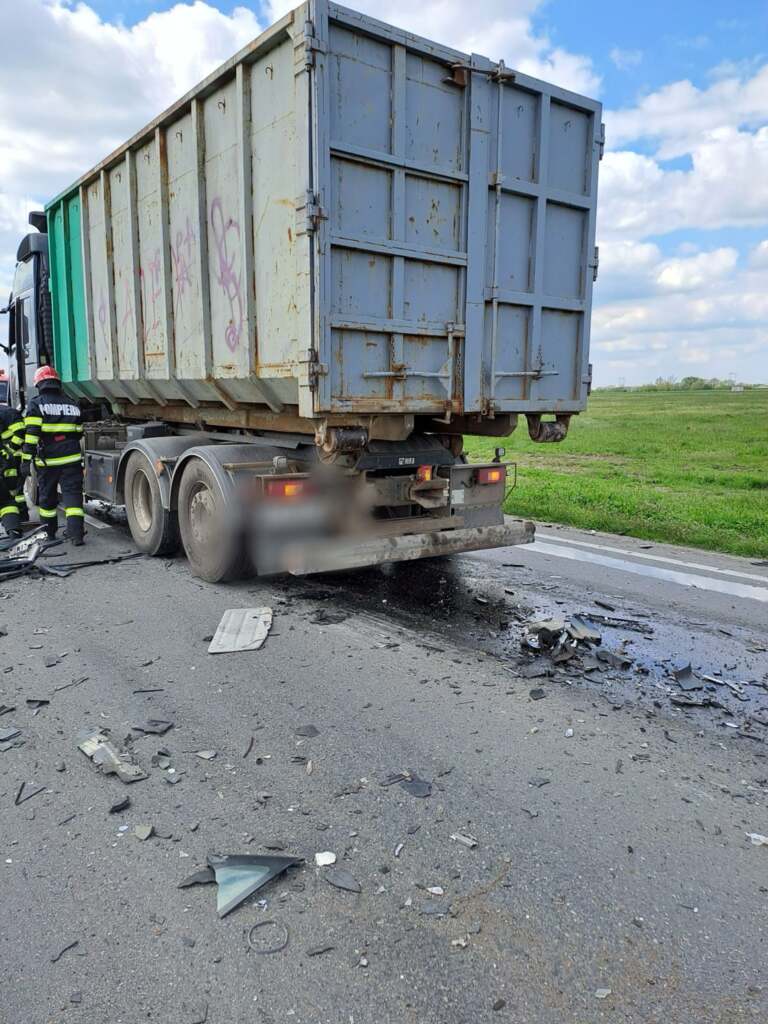 ARAD. Pompierii din cadrul Detașamentului Arad au intervenit cu o autospecială de descarcerare și un echipaj SMURD – Terapie Intensivă Mobilă la un accident rutier produs între un autocamion și un autoturism, pe centura Aradului, zona BAT.