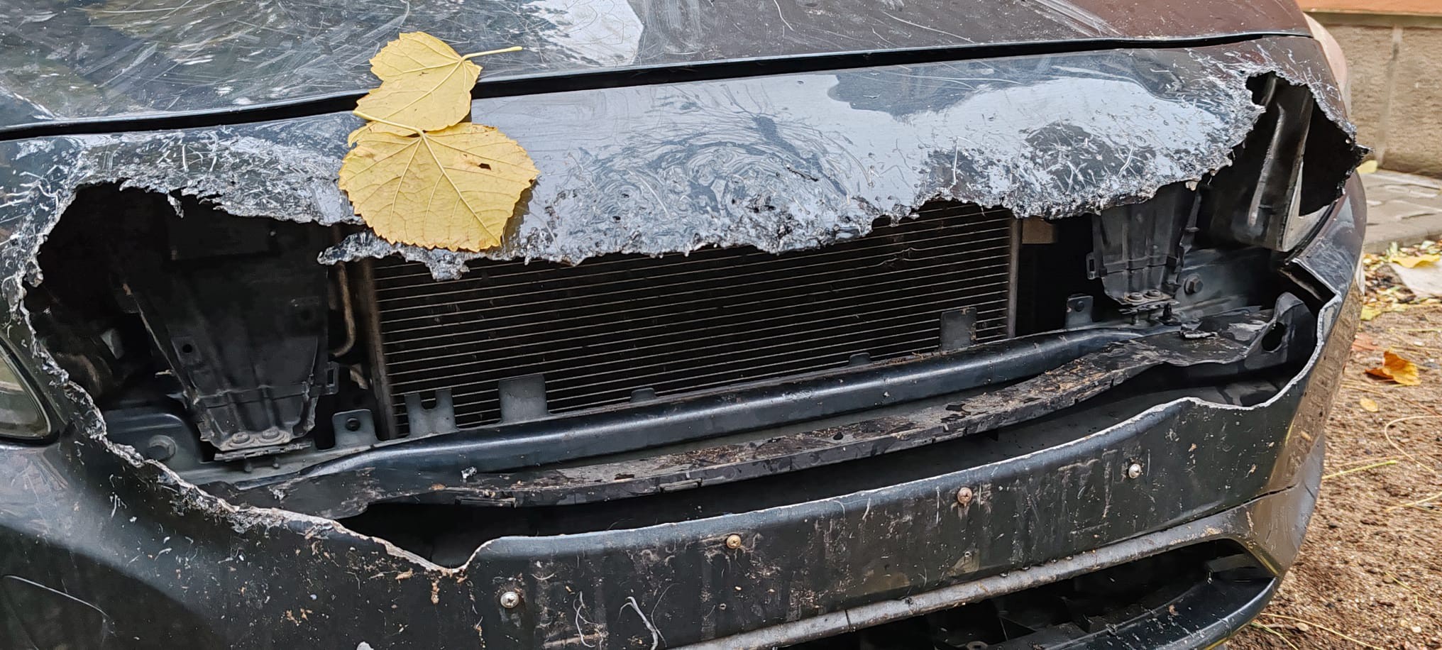 Daca e fcsb-ist, au venit cainii rosii dinamovisti sa ii dea o lectie… Lasand gluma la o parte, cineva i-a dat masina cu untura, altfel nu imi explic cum, din zeci de masini, singura distrusa e fix a lui!