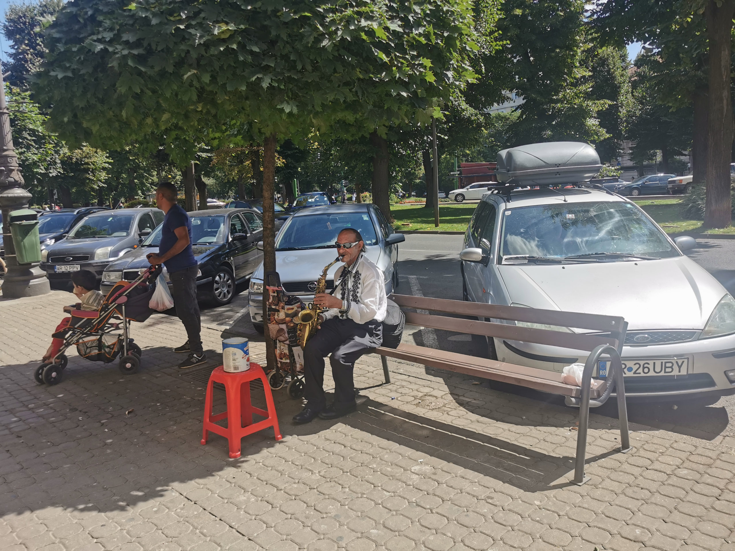 Arad. Miercuri, la orele amiezii, pe Bulevardul Revoluției, în fața covrigăriei Gigi, puteai fi martorul unui mini concert de saxofon oferit de un cetățean care s-a gândit, probabil, că asta-i lipsea arterei principale din municipiu. Muzica autohtonă, nu chiar de scos mireasa din casă, dar pe aproape, te ducea cu gândul la o petrecere câmpenească pe sfârșite, când ultimii rămași se “delectează” cu doine de jale pe fondul excesului de alcool.