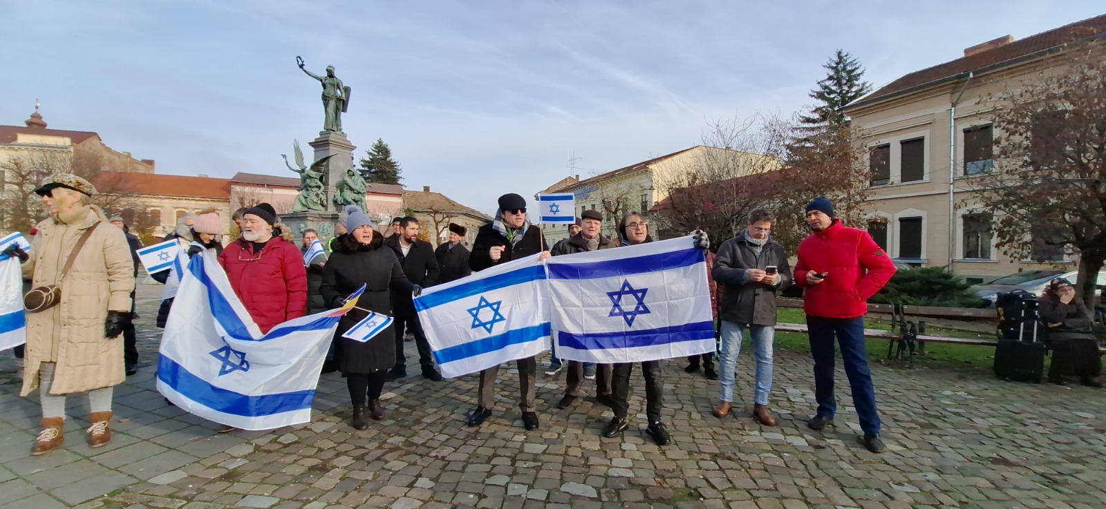 ARAD. Aproximativ 150 de persoane, care purtau steaguri ale României și Israelului, au participat, sâmbătă, la prima manifestare organizată în Arad pentru susținerea statului Israel, afectat de atacurile teroriste din Fâșia Gaza.