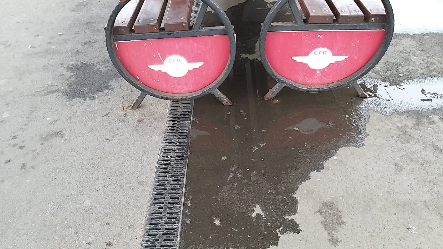 Câteva zeci de minute de ploaie au făcut din peroanele Gării Arad o mică piscină. O parte din acoperișul unuia dintre peroane s-a fisurat, apa curgând “cu găleata” direct pe peron. Rigola de pe mijlocul peroanelor și-a arătat și ea inutilitatea, apa băltind în jurul ei, pe sub bănci și printre picioarele călătorilor, semn că înclinația betonului a fost dată doar în proiectul tehnic, nu și în realitate.