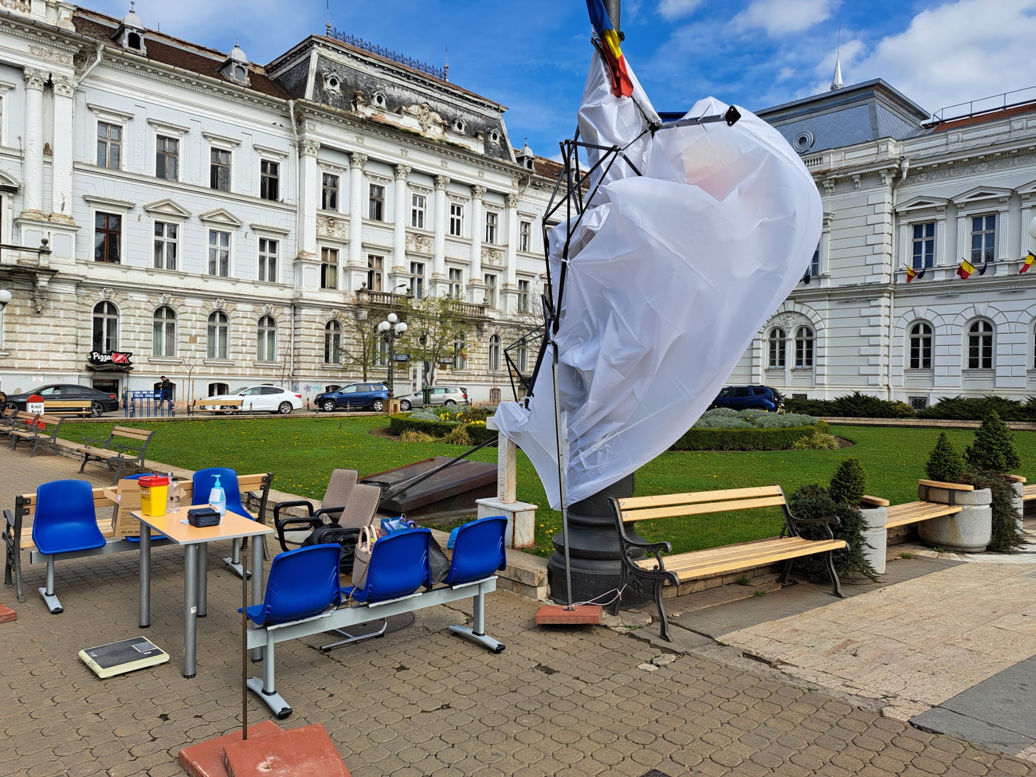 Arad. Sub egida Zilei Mondiale a Sănătății, care se sărbătorește în fiecare an pe data de 7 aprilie, medicii și asistenții medicali din cadrul Spitalului Clinic Județean de Urgență Arad i-au invitat pe arădeni, începând de luni și până vineri, la un consult gratuit (măsurători ale glicemiei, tensiunii arteriale, saturației oxigenului în sânge), pe Platoul Palatului Administrativ. Activitatea a început la orele amiezii și urma să se desfășoare până la ora 17:00, însă cortul amplasat la fața locului nu a rezistat rafalelor de vânt. Acesta a fost luat pe sus și proiectat pe stâlpul de iluminat din apropiere.