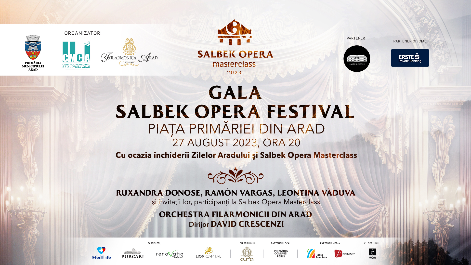 Organizatorii Zilelor Aradului au programat duminică, 27 august, în ultima zi a sărbătorii oraşului, Gala Salbek Opera Festival – eveniment care marchează, totodată, şi închiderea Salbek Opera Masterclass. Concertul extraordinar de operă va avea loc începând de la ora 20:00, pe platoul din faţa Primăriei, cu Orchestra Filarmonicii din Arad, dirijată de David Crescenzi, soliştii Ruxandra Donose, Ramón Vargas, Leontina Văduva şi o parte dintre cursanţii Salbek Opera Masterclass 2023.