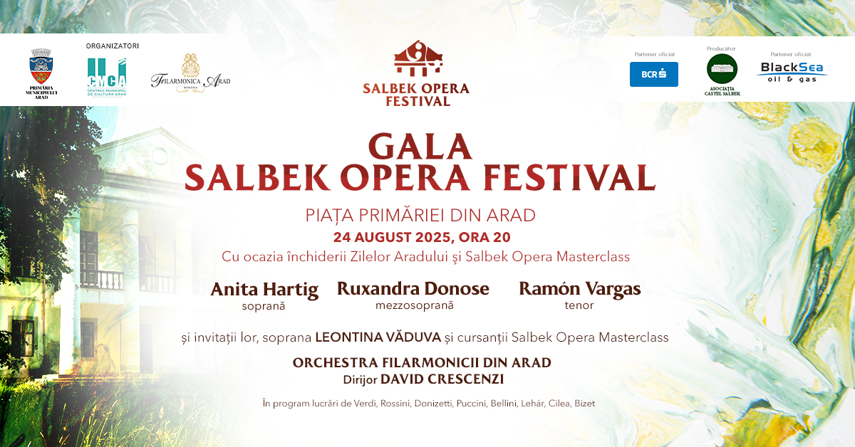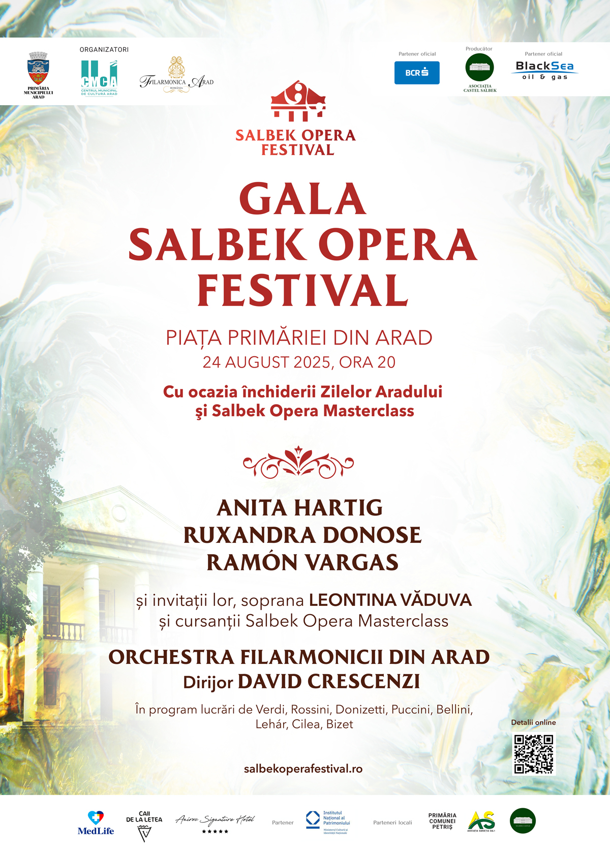 Celebrii cântăreţi de operă Anita Hartig, Ruxandra Donose și Ramón Vargas, care îi vor avea ca invitați pe Leontina Vǎduva și pe cursantii Salbek Opera Masterclass vor fi soliştii Galei care va avea loc pe 24 august, de la ora 20:00, în aer liber, pe platoul din faţa Palatului Administrativ din Arad, cu Orchestra Filarmonicii din Arad, dirijor David Crescenzi, în cadrul Zilelor Aradului 2025.