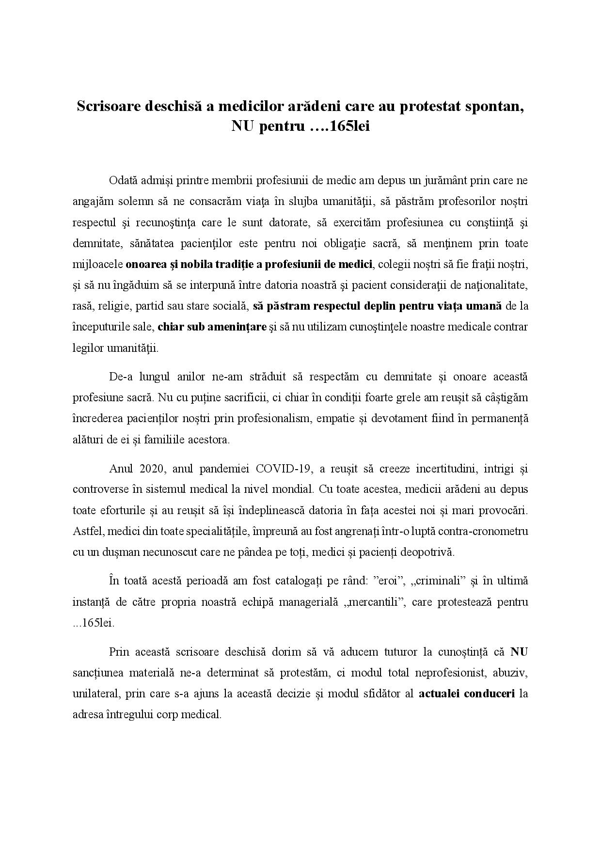 “Marea majoritate a medicilor protestatari, care asigură servicii medicale în SCJU Arad, a terminat pregătirea în centre universitare de prestigiu și a încercat să aducă sistemul medical arădean la un nivel superior, cât mai performant, prin pregătire superioară și prin viziuni moderne, obiective, practice și practicabile în interesul pacienților noștri. Menționam că, asemeni nouă, sunt mulți alți colegi nemulțumiți de neprofesionalismul actualei conduceri, de departe cel mai lamentabil, însă se tem de represaliile d-nei manager interimar cu care suntem familiarizați în ultimul an. Există din partea actualei conduceri o lipsă de înțelegere minimală a faptului că eficiența și siguranța actului medical depind esențial de un climat de lucru lipsit de tensiuni inutile, care să permită concentrarea pe problemele esențiale care constituie adevărata menire a spitalului: acordarea unor îngrijiri medicale prompte, eficiente, sigure, și, în ultimă instanță-salvarea de vieți. Atât noi cât și dumneavoastră, am fost martori în ultimii ani la decăderea sistemului medical arădean, decădere care are legătură directă cu echipe manageriale incompetente. Este perpetuată numirea în funcții de conducere a unor persoane fără pregătire și experiență în actul managerial, care realizează un “management” de azi pe mâine, lipsit de viziune, lipsit de obiective clare, care nu sunt responsabile în niciun fel pentru propriul amatorism și lipsa de performanță, pentru întreținerea dublului standard și a arbitrariului decizional. Actuala conducere a preferat să ia decizii populiste, fără legătură cu îmbunătățirea mediului profesional și a actului medical, bazate mai mult pe frica de imagine negativă.”