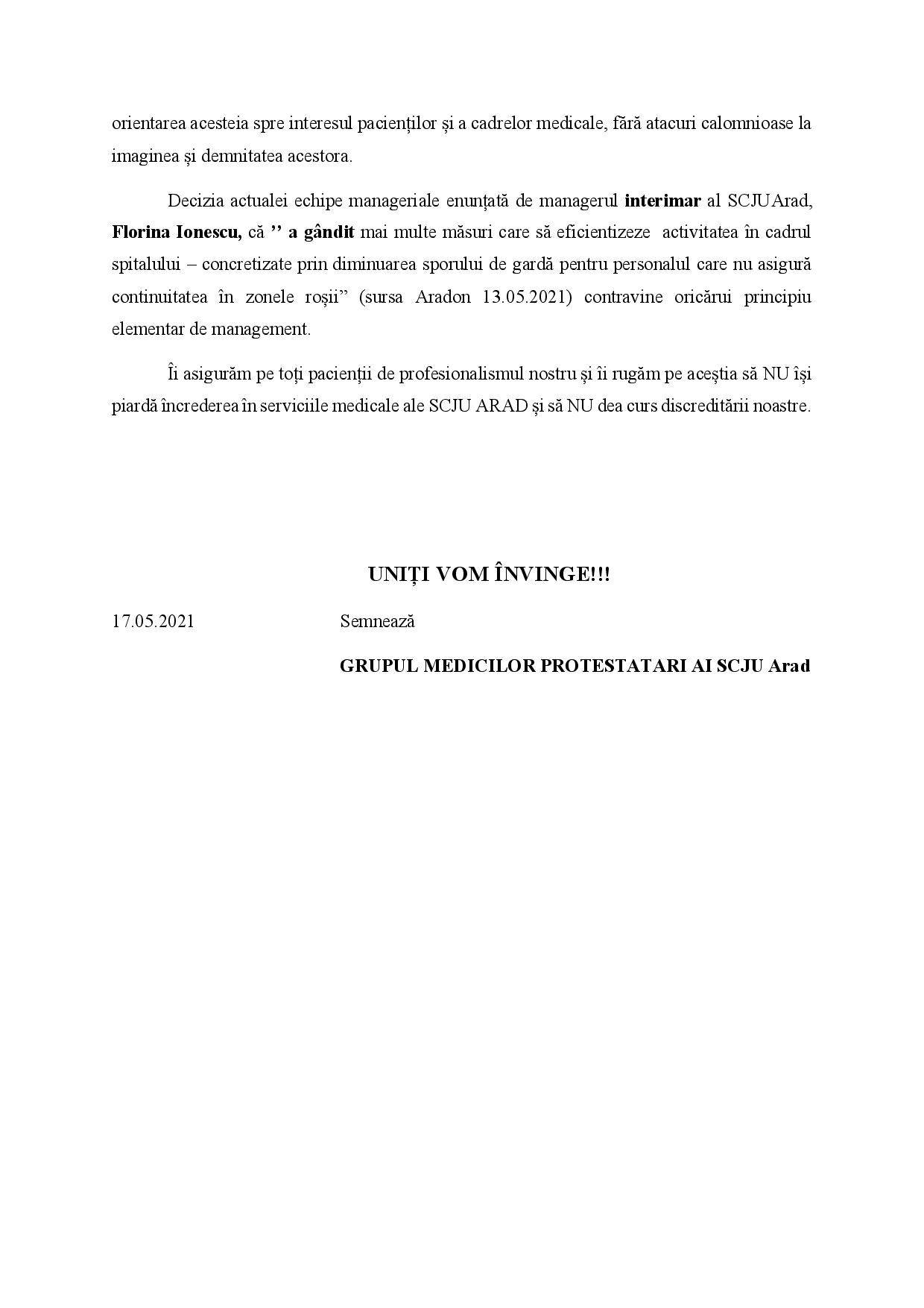 Solicităm factorilor de decizie să dispună măsurile legale necesare pentru înlăturarea incompetenței de la nivelul echipei manageriale interimare actuale a SCJU ARAD și orientarea acesteia spre interesul pacienților și a cadrelor medicale, fără atacuri calomnioase la imaginea și demnitatea acestora. Decizia actualei echipe manageriale enunțată de managerul interimar al SCJU Arad, Florina Ionescu, că ’’a gândit mai multe măsuri care să eficientizeze activitatea în cadrul spitalului – concretizate prin diminuarea sporului de gardă pentru personalul care nu asigură continuitatea în zonele roșii” (sursa Aradon 13.05.2021) contravine oricărui principiu elementar de management. Îi asigurăm pe toți pacienții de profesionalismul nostru și îi rugăm pe aceștia să NU își piardă încrederea în serviciile medicale ale SCJU ARAD și să NU dea curs discreditării noastre”, își încheie apelul către arădeni, medicii protestatari.