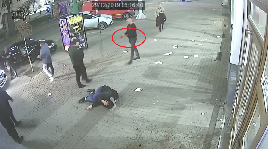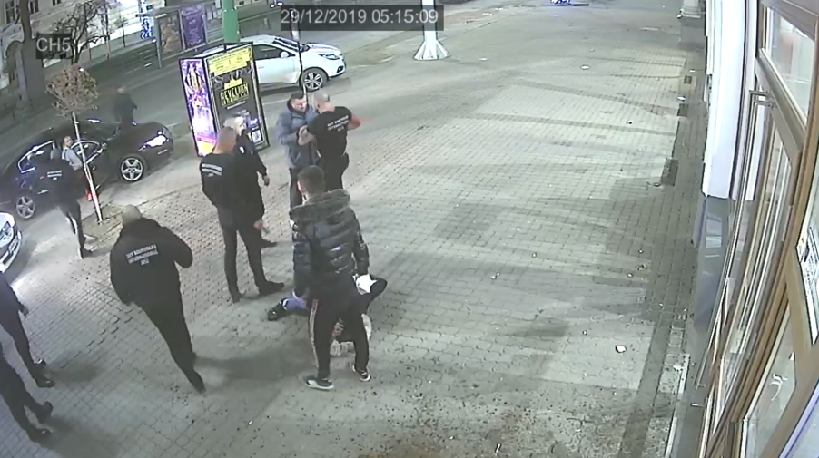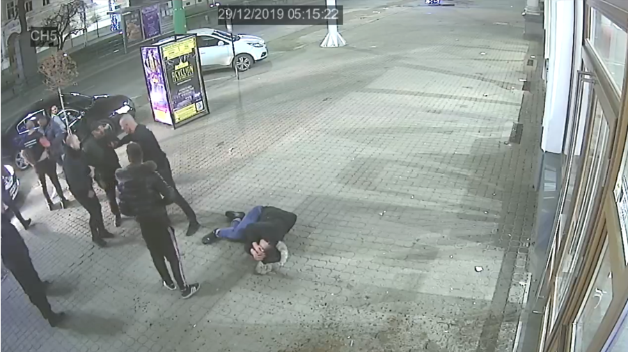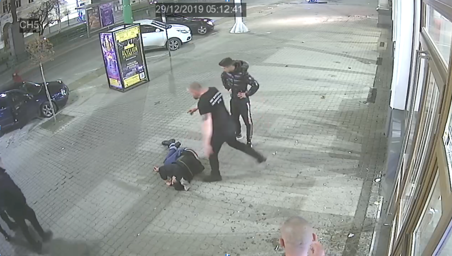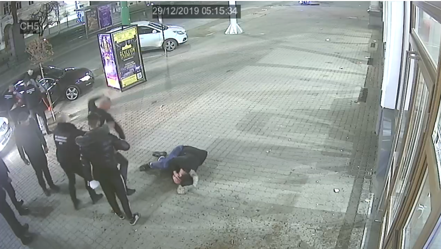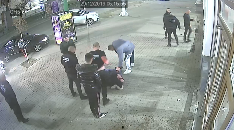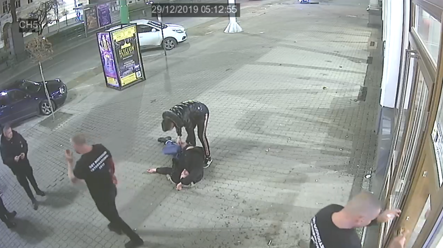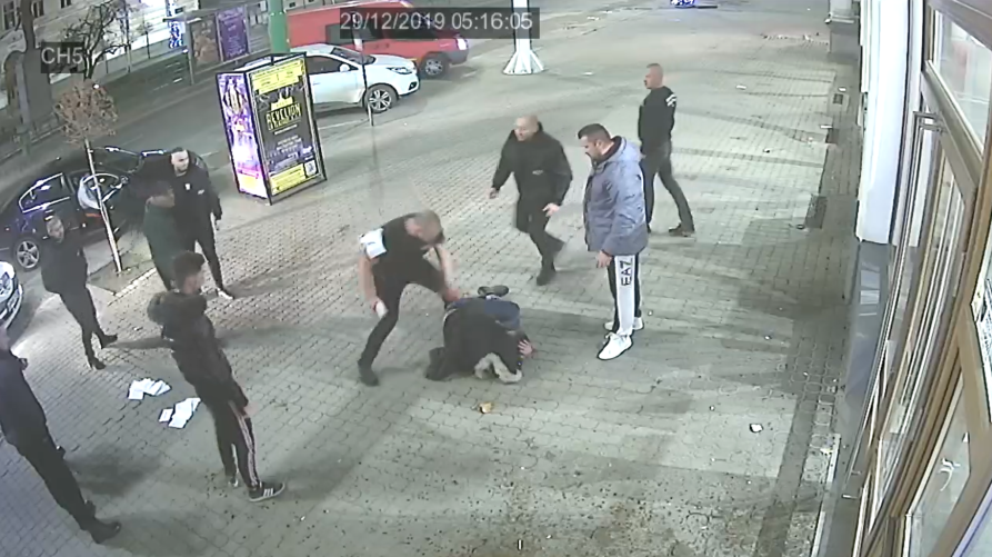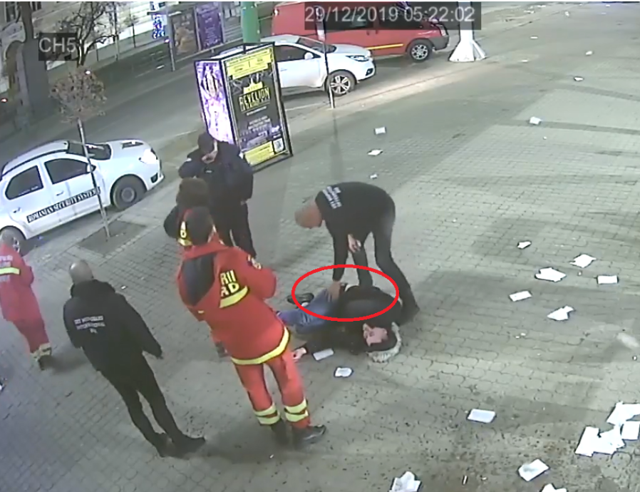 Începem de la minutul 05:12:41. Tânărul despre care se susține că l-ar fi înjunghiat pe agentul de pază zace pe jos, inconștient. Anterior, mai multe persoane, agenții de pază ai firmei, au tâbărât asupra lui lăsându-l în stare de inconștiență. Revenind la minutul 05:12:41 – agentul de pază care susține că a fost înjunghiat de tânăr îi aplică acestuia o lovitură puternică în zona rinichilor.