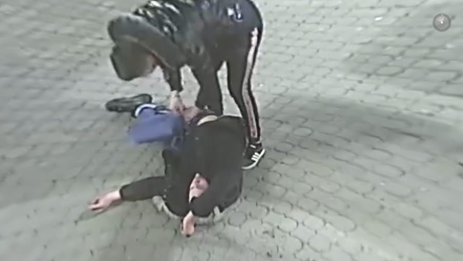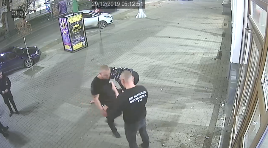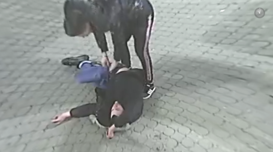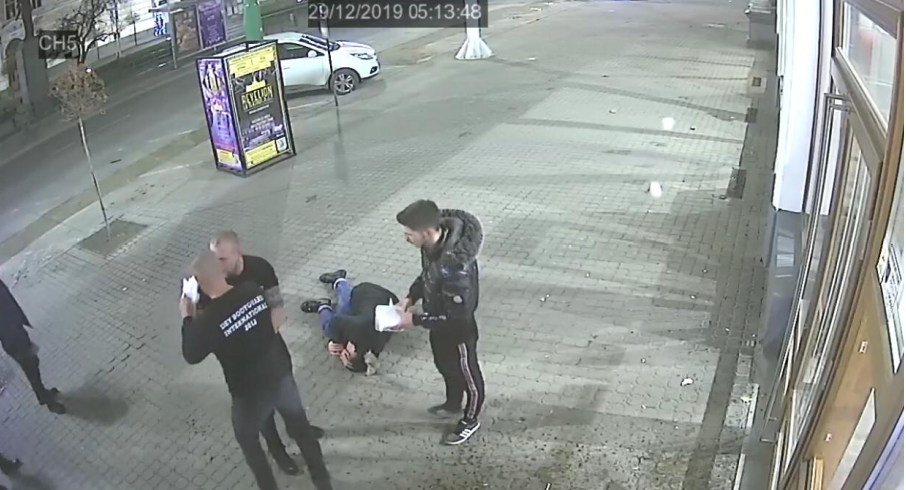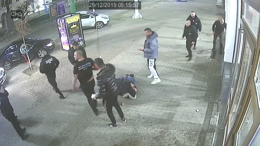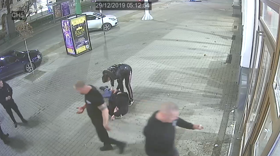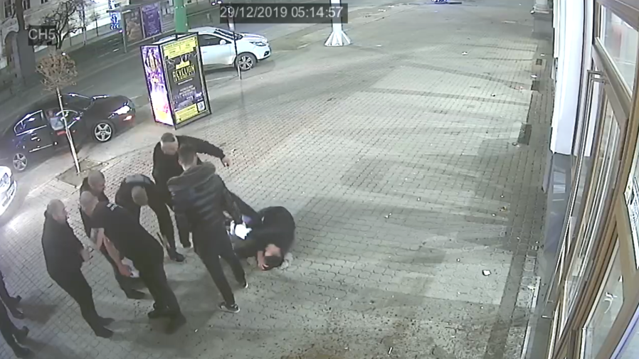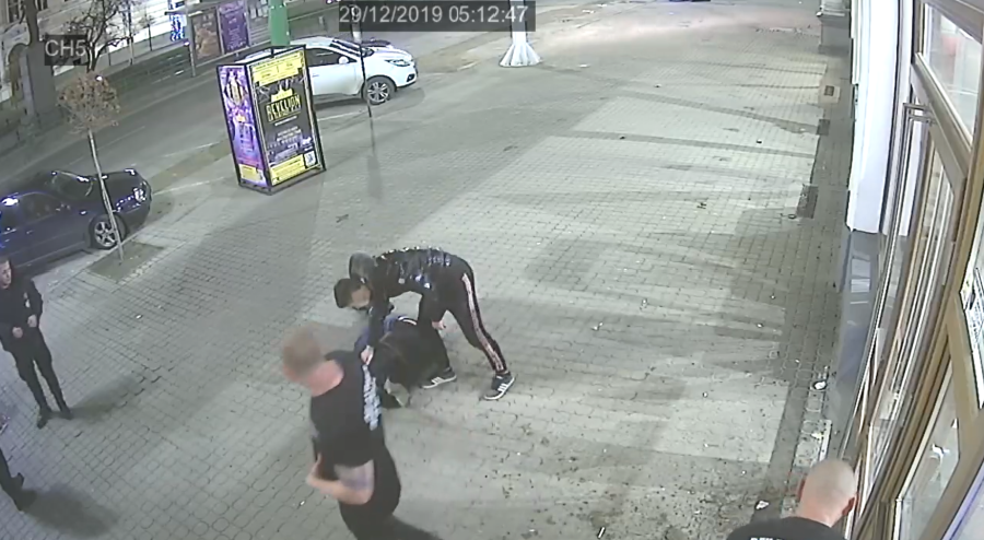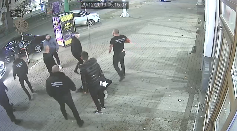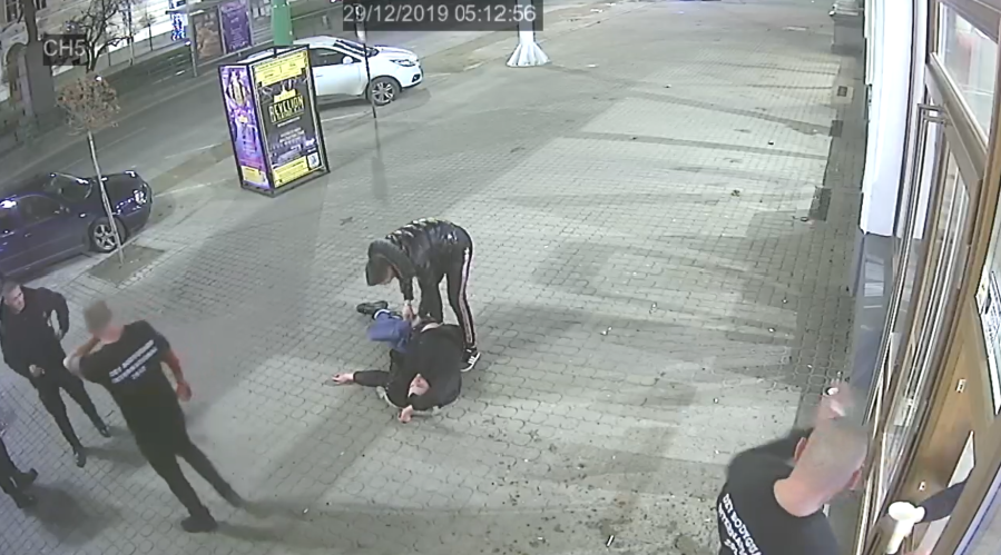 Începem de la minutul 05:12:41. Tânărul despre care se susține că l-ar fi înjunghiat pe agentul de pază zace pe jos, inconștient. Anterior, mai multe persoane, agenții de pază ai firmei, au tâbărât asupra lui lăsându-l în stare de inconștiență. Revenind la minutul 05:12:41 – agentul de pază care susține că a fost înjunghiat de tânăr îi aplică acestuia o lovitură puternică în zona rinichilor.