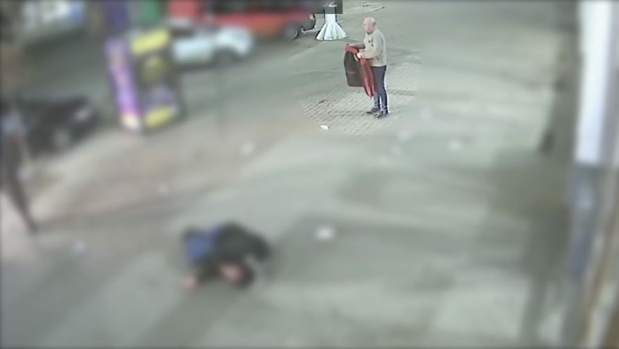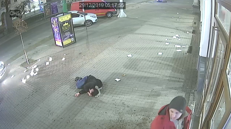 05:17:55 – Persoana cu haină roșie trece pe lângă tânărul inconștient și se apropie de geamul restaurantului.