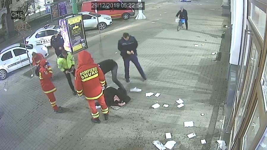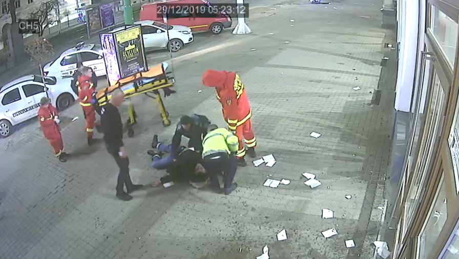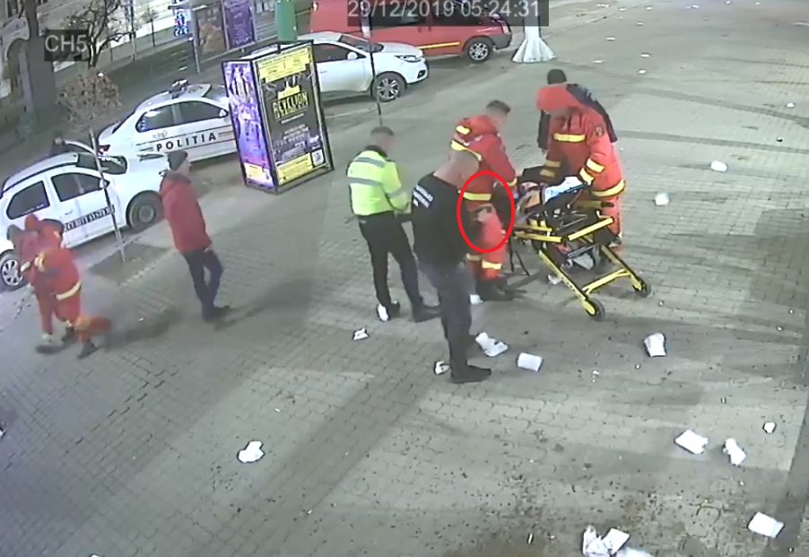 05:22:02 – La sosirea echipajului SMURD, agentul de pază pare că efectuează percheziția asupra tânărului. Deși mâna sa este pe buzunarul în care umblase și tânărul în geacă neagră, nu scoate nimic din interior.