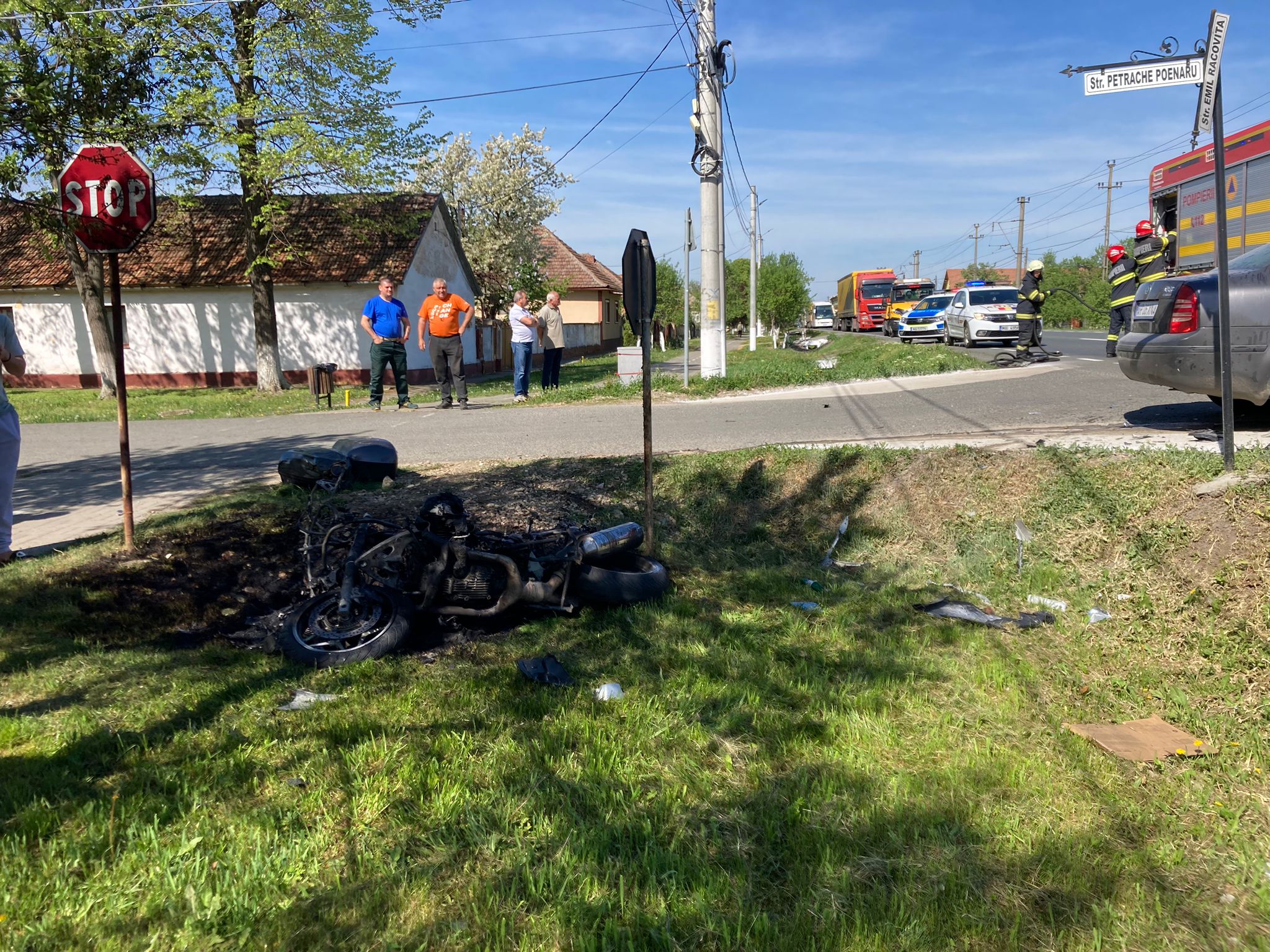În urma impactului dintre cele două vehicule, motocicleta a luat foc, arzând în întregime.