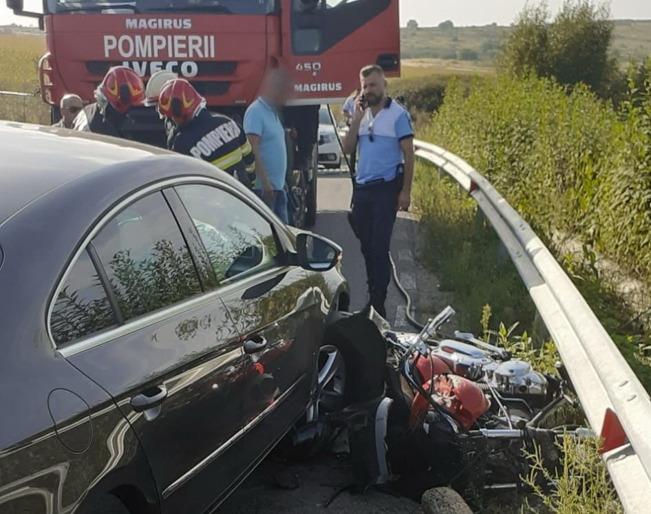 UPDATE. Motociclistul de 30 de ani a fost extras, inconștient, de sub mașină