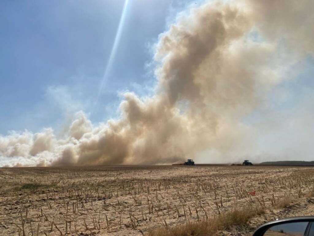 UPDATE 2: Incendiul dintre Aluniș și Frumușeni se manifestă pe o suprafață foarte mare, fiind afectate lanuri de grâu, dar și rapiță. Fumul dens provocat de incendiu a ajuns până în municipiul Arad.