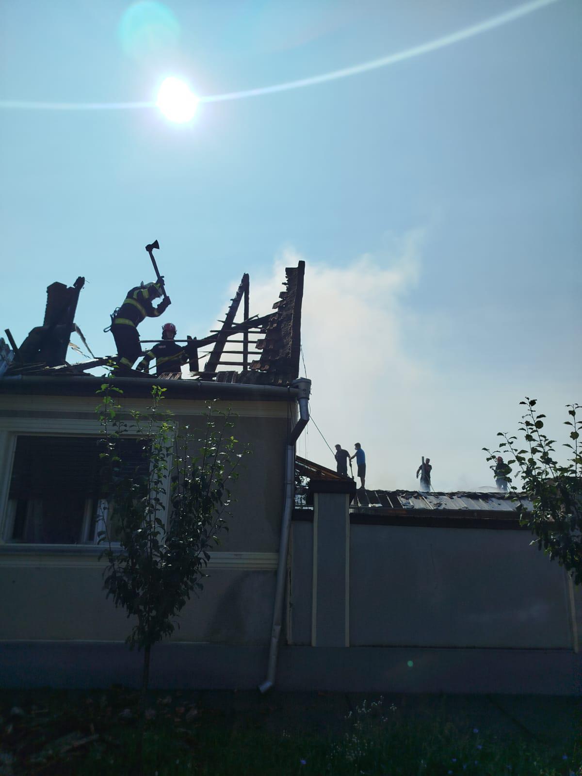 UPDATE. Incendiul, care s-a manifestat la nivelul acoperișului casei și la două încăperi ale locuinței, a fost localizat și lichidat, transmite ISU Arad. Au ars acoperișul casei, pe o suprafață de aproximativ 100 de metri pătrați și două încăperi cu bunurile aflate în interior. Au fost salvate o parte din casă, o anexă gospodărească și o magazine.