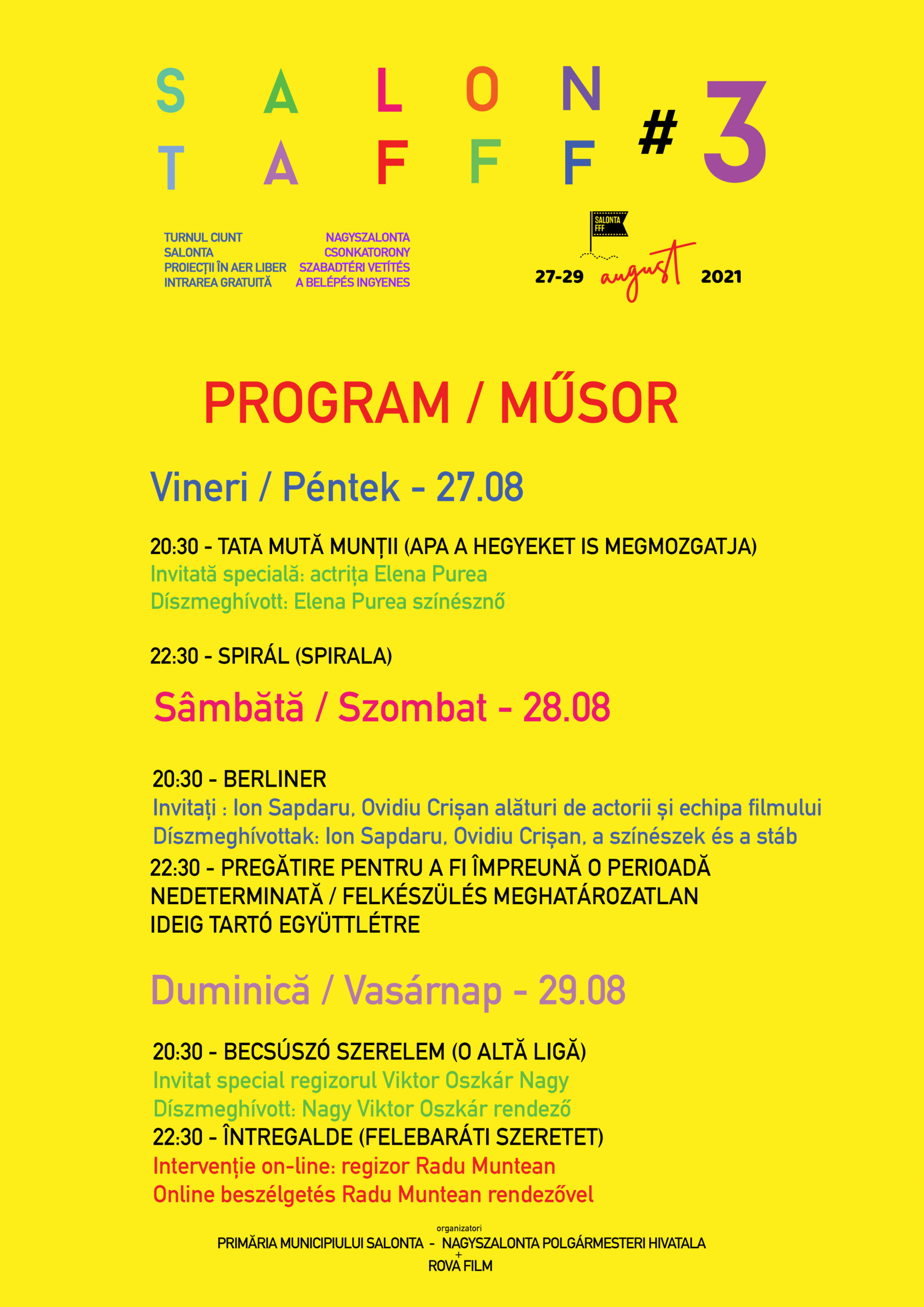 Ca și la edițiile precedente, proiecțiile vor fi urmate de întâlnirea publicului cu invitații festivalului pentru sesiuni de întrebări și răspunsuri pe marginea filmelor vizionate. Toate proiecțiile vor avea loc în aer liber la Turnul Ciunt, Salonta, intrarea fiind gratuită. Festivalul va respecta măsurile de siguranță impuse pentru prevenirea contaminării cu noul coronavirus SARS-CoV-2.