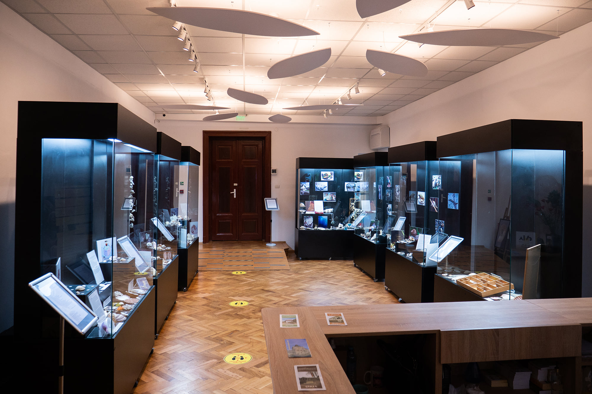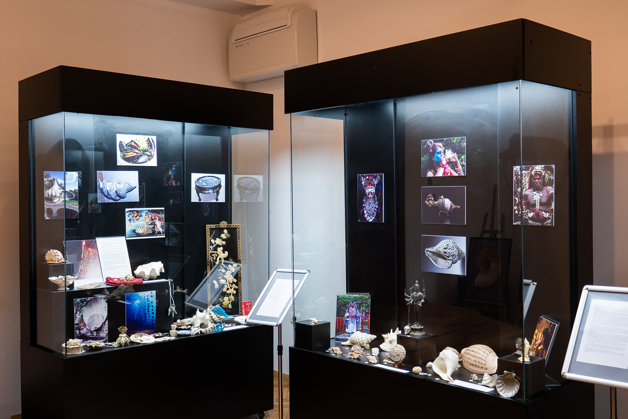 „Colecțiile expuse cuprind cochilii de melci și valve de scoici de pe teritoriul județului Arad, a României dar și din zone îndepărtate ale globului pământesc.Astfel, vizitatorii au ocazia să admire peste 170 de specii de moluște din familiile Cassidae, Conidae, Cypraeidae, Haliotidae, Helicidae, Muricidae, Ovulidae, Strombidae, Tonnidae, Cardiidae, Mytilidae, Ostreidae, Pectinidae, Margarititiferidae, Pinnidae, Tridacnidae, Unionidae, Nautilidae, Sepiidae etc. dar și obiecte realizate din cochilii de gasteropode și valve de lamelibranhiate. Moluștele sunt animale nevertebrate, cu corpul moale (lat. mollis – moale), cu simetrie bilaterală (alterată la melci de fenomenul de torsiune) și cu corp nesegmentat. Cuprinde organisme cum ar fi (cele mai cunoscute): melcul de livadă, limaxul, scoica de lac, sepia, nautilul sau caracatița etc.Cea mai mare parte dintre exponate sunt animale marine, existând însă și specii dulcicole și terestre.
