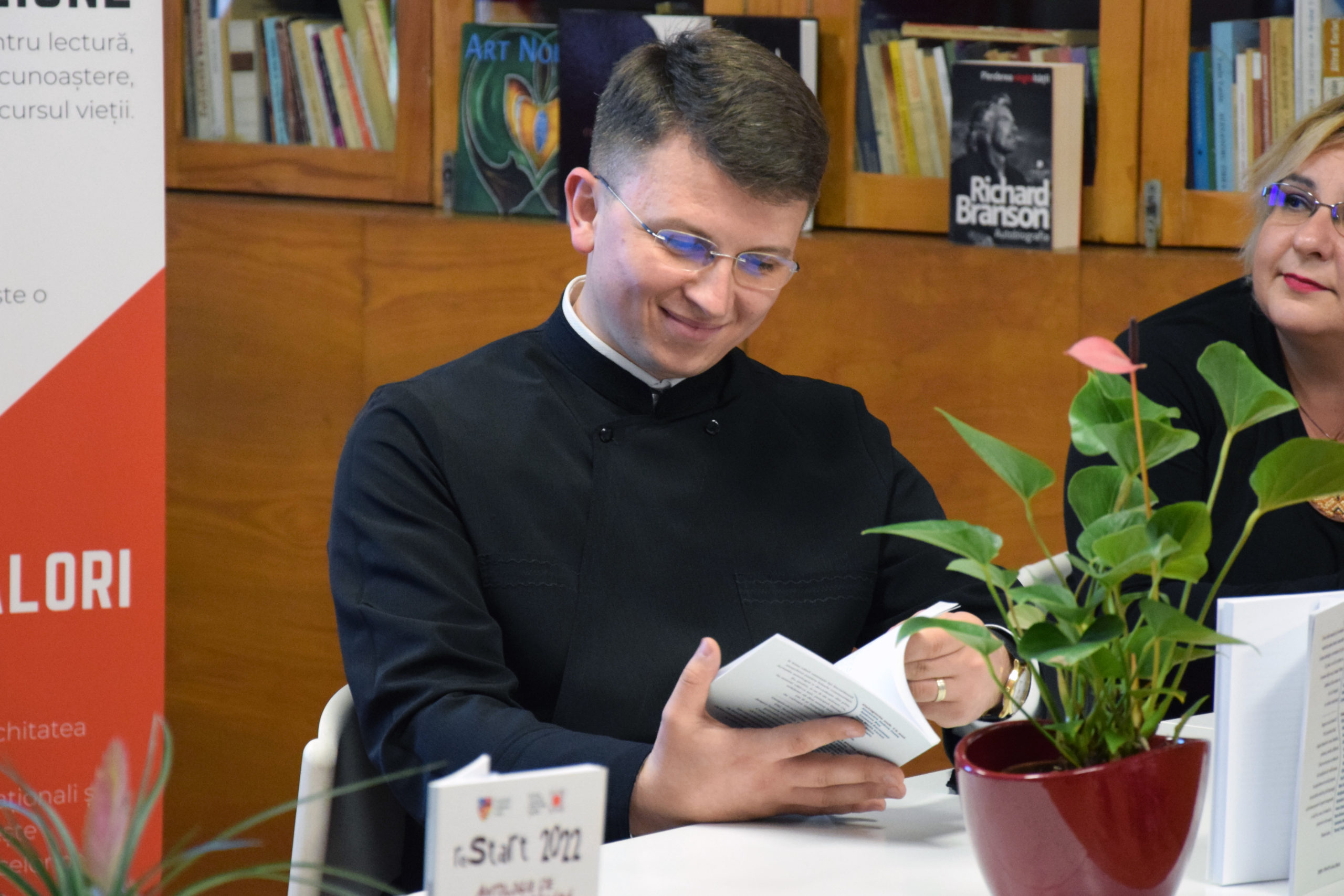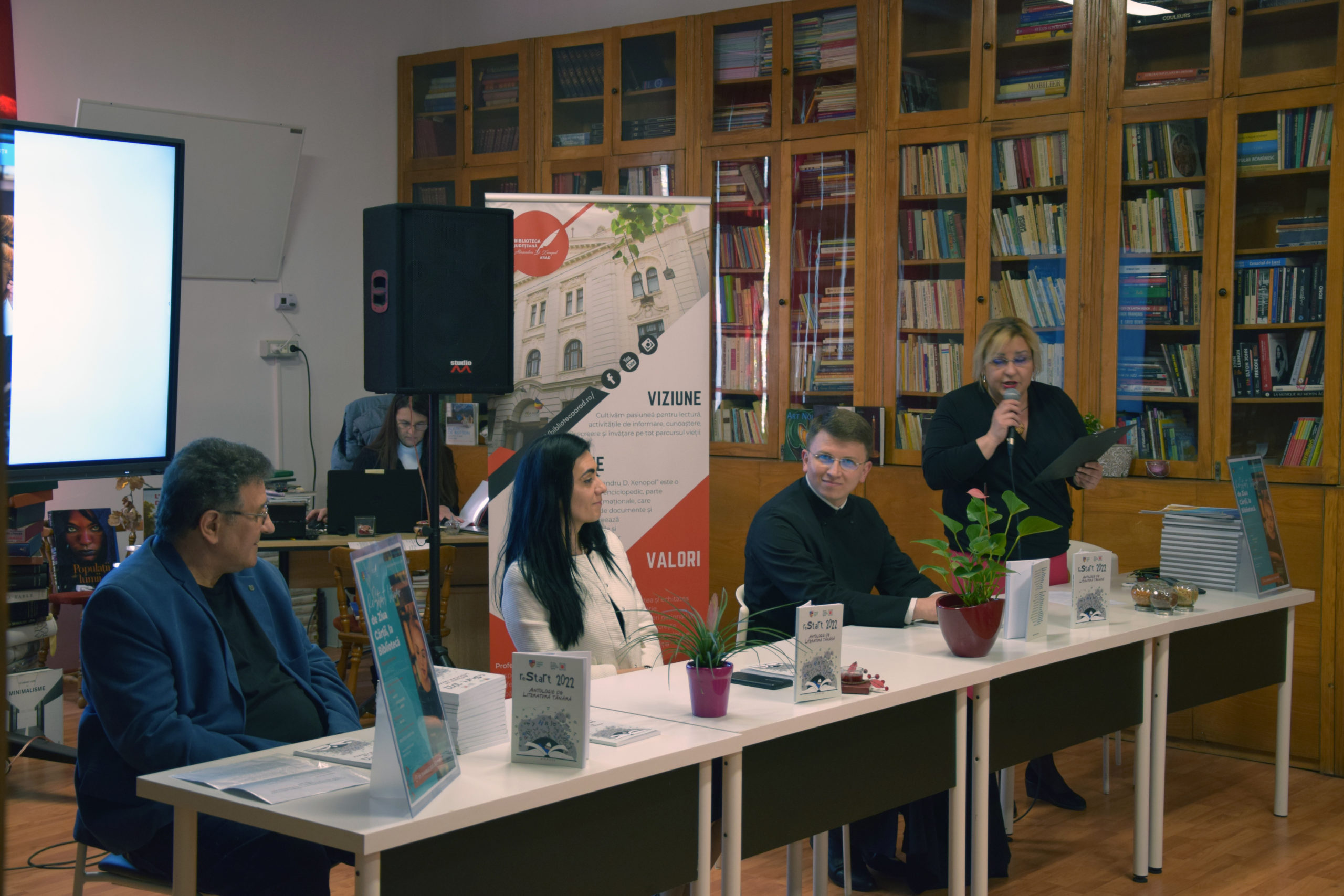 Moderator al întâlnirii a fost Ioana Nistor, profesor documentarist în cadrul bibliotecii, în prezidiu aflându-se Ioan Matiuț, editorul antologiei și coordonatorul proiectelor „reStart Ltierar” și „Arad LiterArt”, Kuschausen Cristina, inspector școlar în cadrul IȘJ Arad, respectiv preotul Vlad-Sergiu Sandu, parte a echipei celor două proiecte menționate.